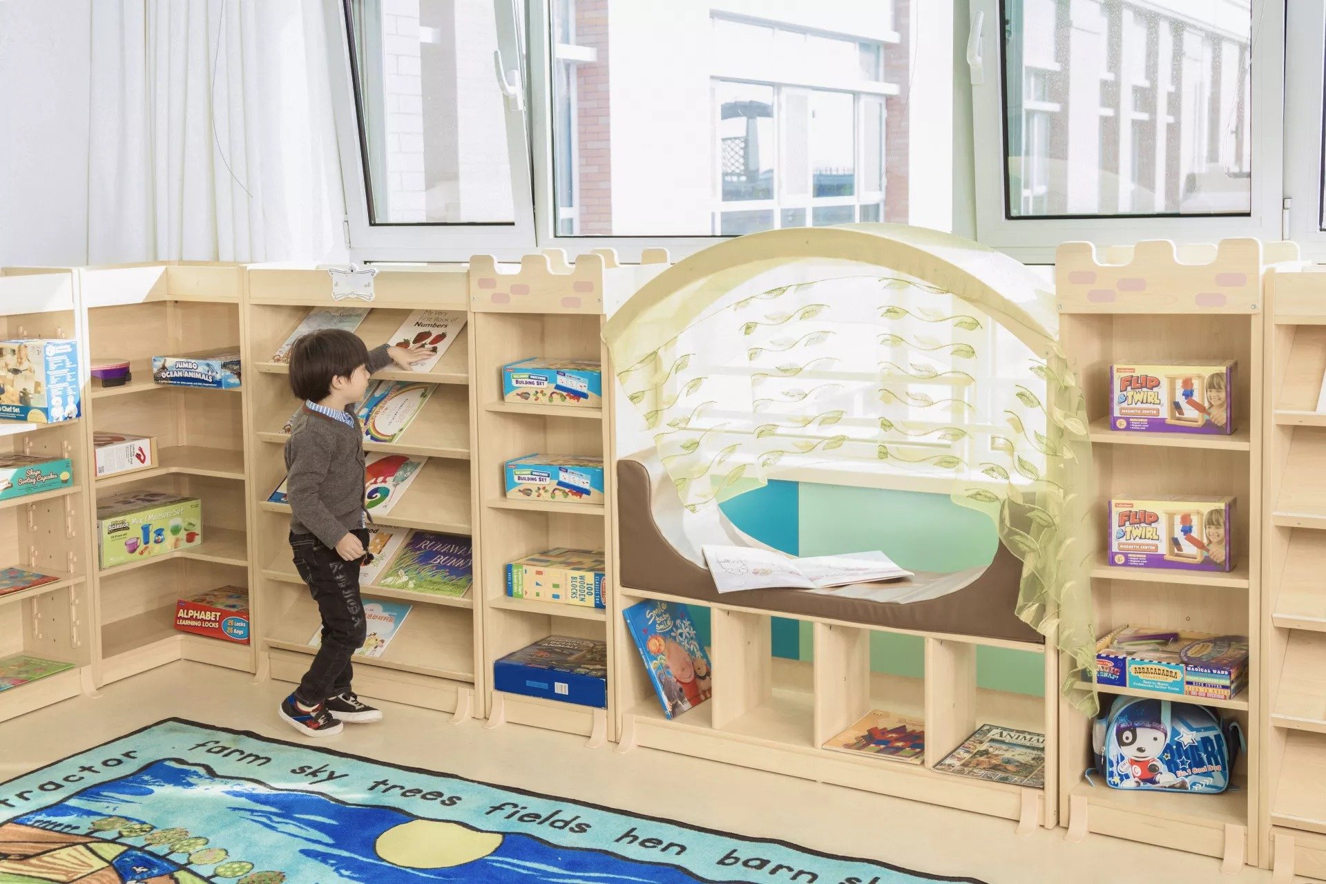 Créez un espace chaleureux pour les jeunes esprits curieux avec notre coin de lecture et de jeu spécialement conçu pour les crèches, les haltes-garderies, les jardins d'enfants et autres structures d'accueil de jeunes enfants.