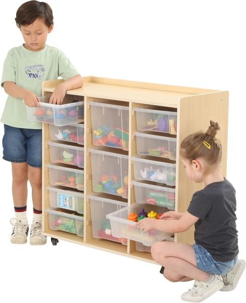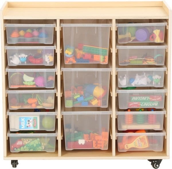 Avec ses trois rangées équipées de 12 petits bacs et 3 grands bacs, cette unité de rangement offre une solution transparente et ordonnée pour le stockage des différents articles. Les bacs en polypropylène transparent permettent aux enfants et au personnel de voir facilement le contenu, ce qui encourage l'autonomie des petits lorsqu'ils cherchent ou rangent les jouets. Les roulettes optionnelles ajoutent une flexibilité appréciable, facilitant le déplacement de l'étagère pour la nettoyer ou réorganiser l'espace.