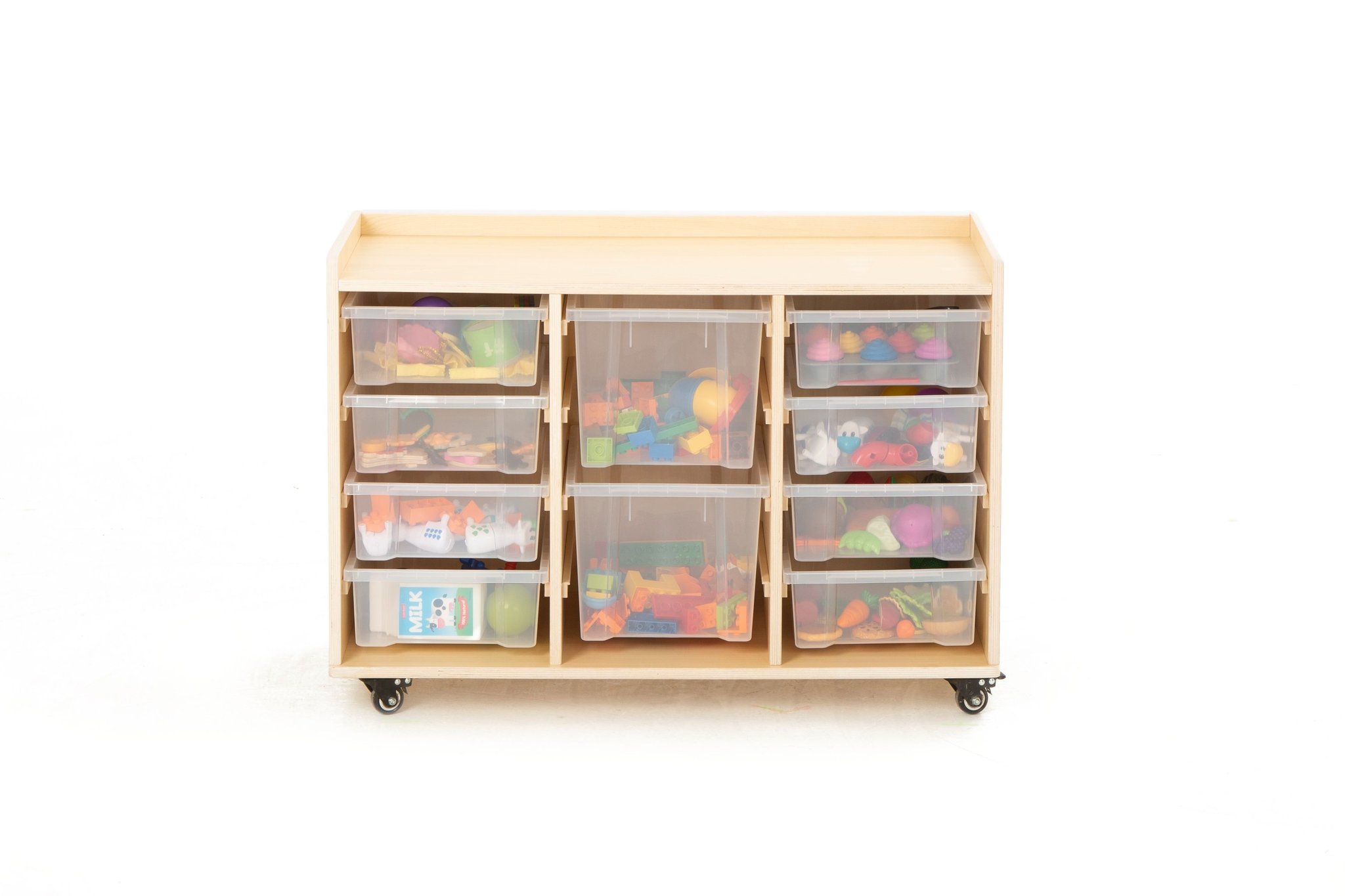 Notre Étagère à 3 Rangées, équipée de 8 petits bacs et 2 grands bacs, une solution de rangement innovante et esthétiquement plaisante, spécialement conçue pour s'adapter aux besoins des crèches, écoles maternelles, jardins d'enfants, et autres espaces d'accueil pour enfants. Fabriquée en multiplex de peuplier avec un revêtement mélaminé aspect érable, cette étagère combine robustesse et élégance, offrant un espace de rangement efficace et organisé pour une variété d'objets, des jouets aux fournitures éducatives.