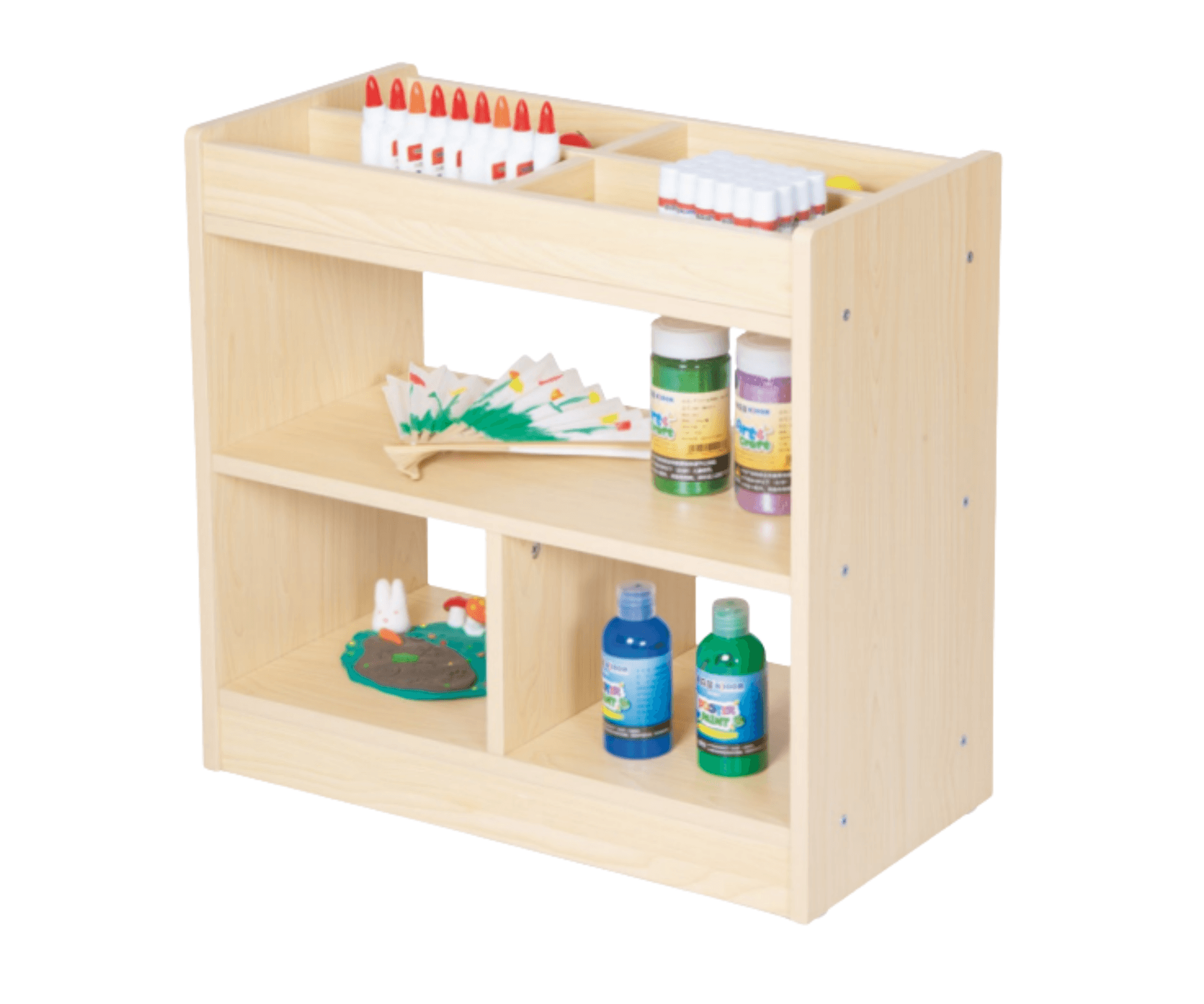 Cette étagère à compartiments est idéale pour organiser le matériel artistique et pédagogique dans les crèches, écoles maternelles et autres structures d’accueil de jeunes enfants. Conçue en bois de caoutchouc avec un placage en érable mélaminé, elle allie robustesse et esthétisme pour un usage quotidien intensif. Ses multiples compartiments permettent de trier facilement crayons, pinceaux, papiers, pots de peinture et autres fournitures, offrant ainsi un accès rapide et ordonné aux outils de création.