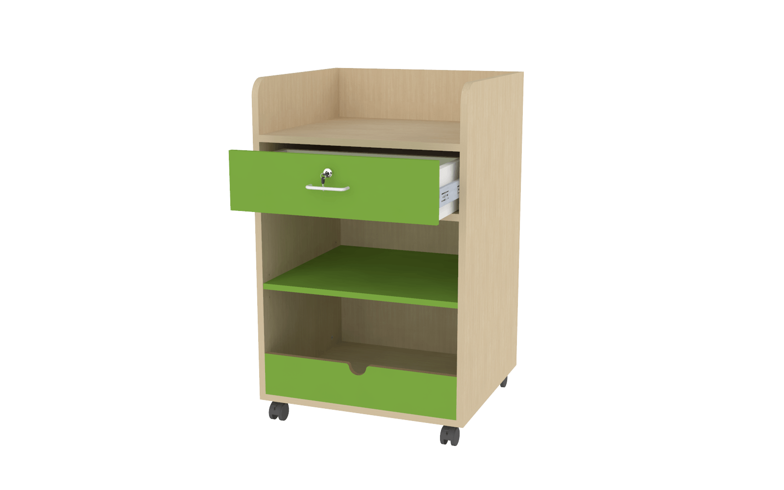Ce meuble est équipé d’une roulette à frein pour un déplacement facile et sécurisé, ainsi que d’une serrure à clé intégrée pour sécuriser les documents ou objets sensibles. Il est conforme aux normes de qualité NF EN 16121 + A1, garantissant un mobilier adapté aux exigences des établissements recevant du jeune public.