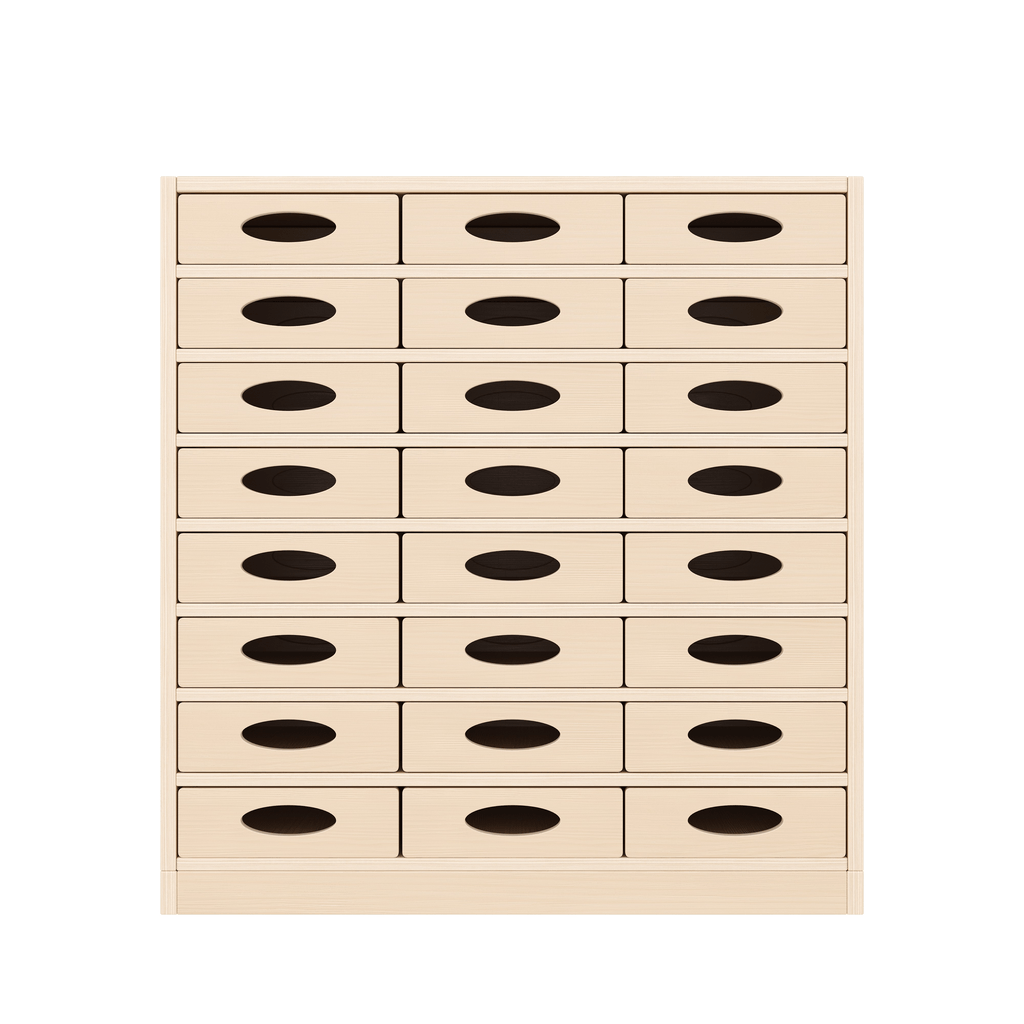 Grâce à ses 24 compartiments, ce meuble facilite le classement du matériel par thématique, favorisant ainsi un environnement structuré et propice au développement de l’enfant. En permettant aux tout-petits de voir et choisir eux-mêmes leurs jeux ou outils de manipulation, il encourage l’autonomie progressive et la prise d’initiative, dans un esprit inspiré des approches Montessori et Reggio Emilia.