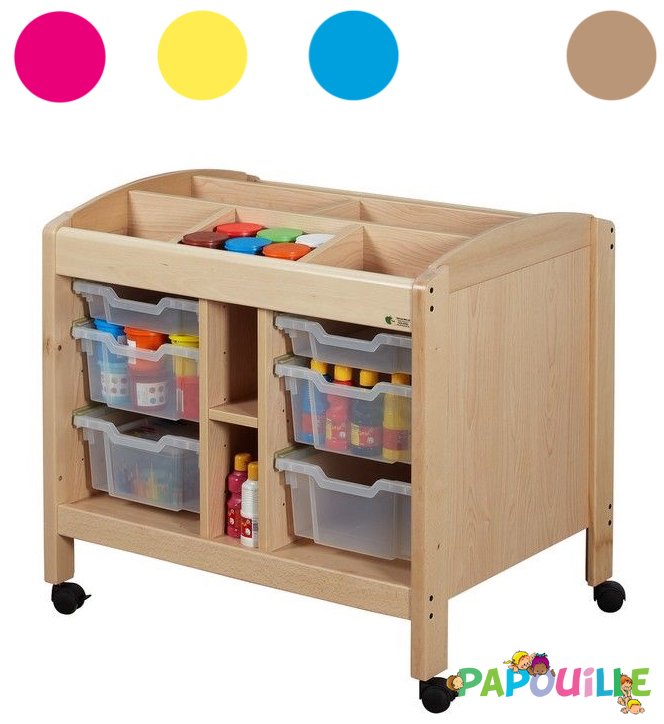 Le meuble de rangement est fabriqué à partir de matériaux de haute qualité, offrant une grande résistance et une excellente durabilité pour une utilisation intensive en crèche. Équipé de 4 roues avec freins, cela facilite le déplacement, le rangement et la distribution du matériel.