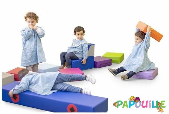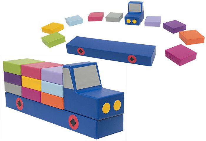 Il est fabriqué en mousse souple et est recouvert d'un revêtement en polyester doux et résistant. Le camion en mousse est composé d'une banquette 4 places, d'un fauteuil, et de 9 coussins.