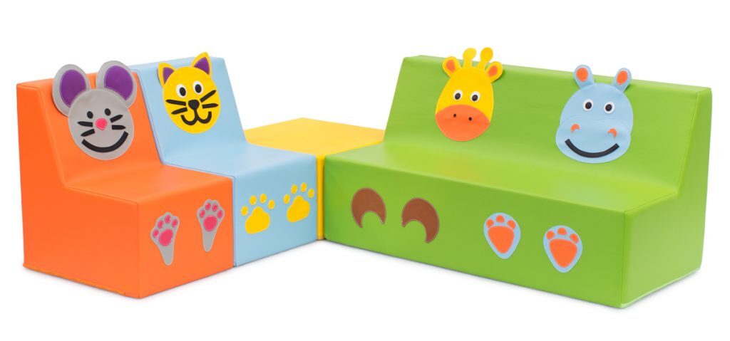 Un ensemble est composé d'un canapé, de fauteuils et une table en mousse, un matériau souple et confortable.