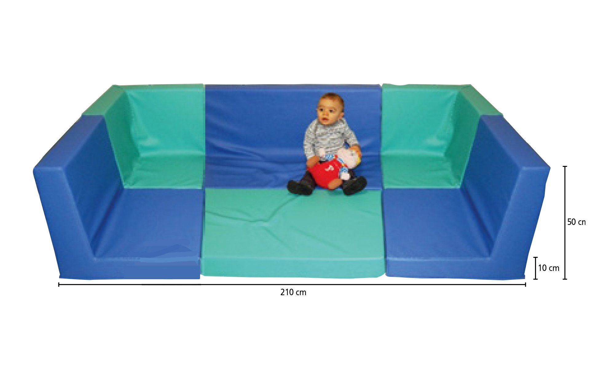Grâce à sa mousse ferme et indéformable, cet ensemble assure un excellent maintien tout en offrant un confort optimal. Les différents modules – banquette, chauffeuses, rebords d’angle et tapis – se fixent solidement par velcro, garantissant une stabilité renforcée lors des activités.