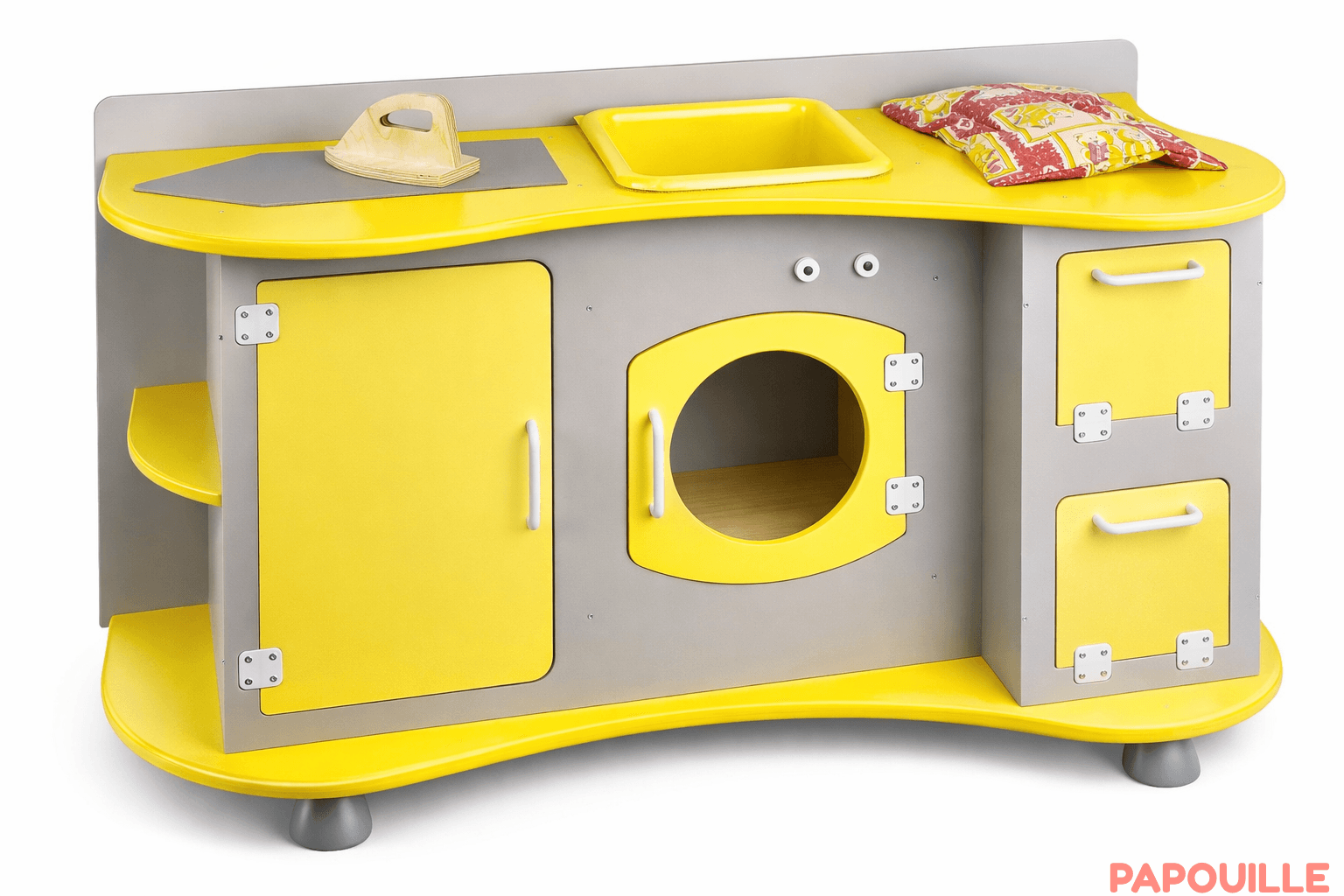 Ce meuble tout-en-un intègre une armoire de rangement, un lave-linge factice, une penderie, deux tiroirs coulissants, une table à langer, une bassine, ainsi qu’une table à repasser avec fer : un véritable mini-univers domestique à leur portée.
