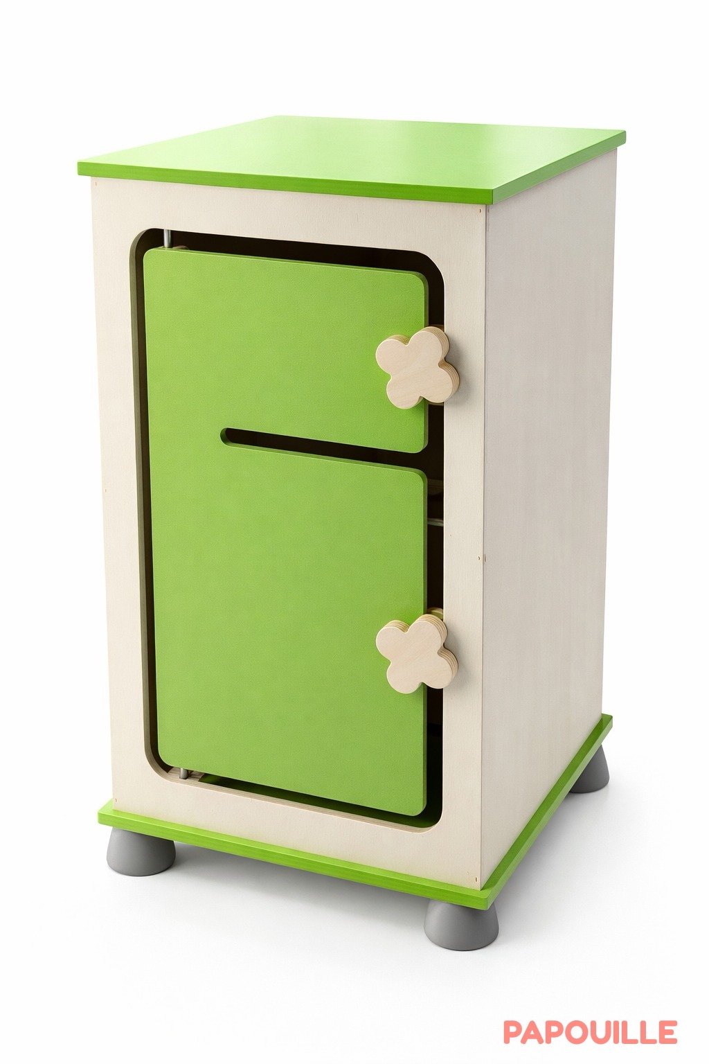Fabriqué en France à partir de bois de bouleau certifié PEFC, ce réfrigérateur miniature s’inscrit dans une démarche écoresponsable, tout en assurant robustesse et longévité dans un cadre d’usage. Sa finition laquée aux couleurs vives attire l’œil et s’intègre harmonieusement dans les coins dînette ou les espaces de jeux symboliques.