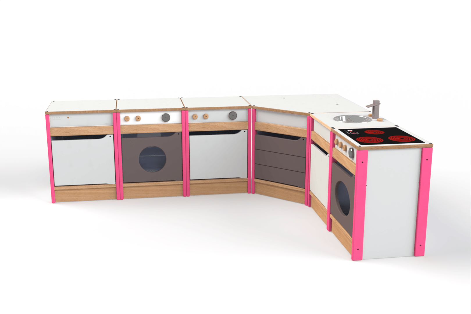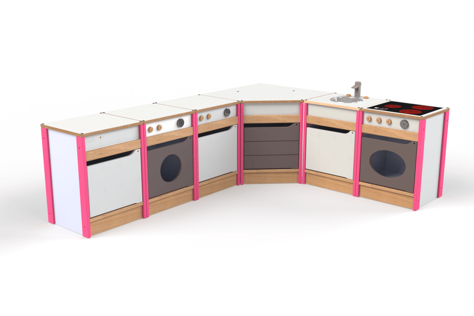 Composé de 6 meubles fonctionnels (évier, lave-vaisselle, machine à laver, cuisinière, réfrigérateur et meuble de rangement), ainsi qu’une tablette d’angle, cet ensemble est pensé pour un usage intensif en collectivité. Sa conception en hêtre massif et en panneaux mélaminés garantit une grande résistance aux manipulations répétées. Ses finitions soignées, avec des portes en polymère (MDF revêtu PVC) et des marquages inaltérables, offrent un rendu réaliste qui stimule le jeu d’imitation.
