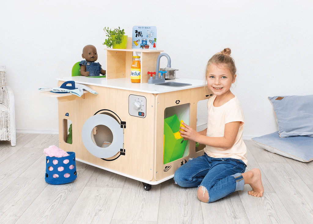 La cuisine intégrée inclut des plaques de cuisson, un four avec boutons rotatifs et un évier réaliste. Juste à côté, la buanderie simule une machine à laver avec un tambour pivotant et des accessoires pour le repassage, parfait pour apprendre en s’amusant. La chaise intégrée pour poupées offre un espace interactif où les enfants peuvent nourrir ou prendre soin de leurs jouets préférés, favorisant les jeux d’imitation.