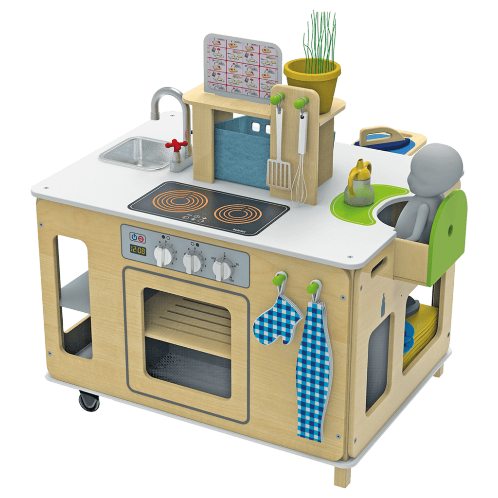 Le centre de jeu multifonction 4-en-1 est un espace d’imitation polyvalent conçu pour stimuler la créativité et l’apprentissage des jeunes enfants. Combinant une cuisine, une buanderie, un espace de rangement et une zone repas pour poupées, ce module est parfait pour favoriser le jeu symbolique et le développement des compétences sociales. Idéal pour les centre d'accueil de jeunes enfants et les espaces de jeu collectif, il permet aux enfants de se plonger dans des activités réalistes telles que la cuisson, le nettoyage et les soins des poupées.