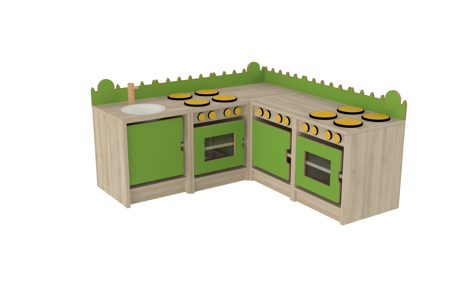 Offrez aux tout-petits un espace de jeu stimulant et sécurisé avec cet ensemble cuisine d’angle tout équipé, pensé pour les structures d’accueil de jeunes enfants. Conçu en bois multiplis robuste avec des finitions en stratifié décoratif vert et jaune, cet ensemble combine esthétisme, solidité et sécurité pour accompagner le jeu symbolique dès le plus jeune âge.