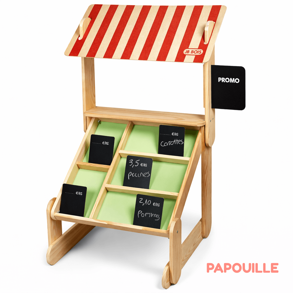 Idéal pour stimuler l’imagination des tout-petits, cet étal de marchande en bois est un jeu d’imitation incontournable pour les structures d’accueil de jeunes enfants. Avec ses lignes douces et sa finition soignée, il s’intègre parfaitement dans un coin jeu ou une salle de motricité.