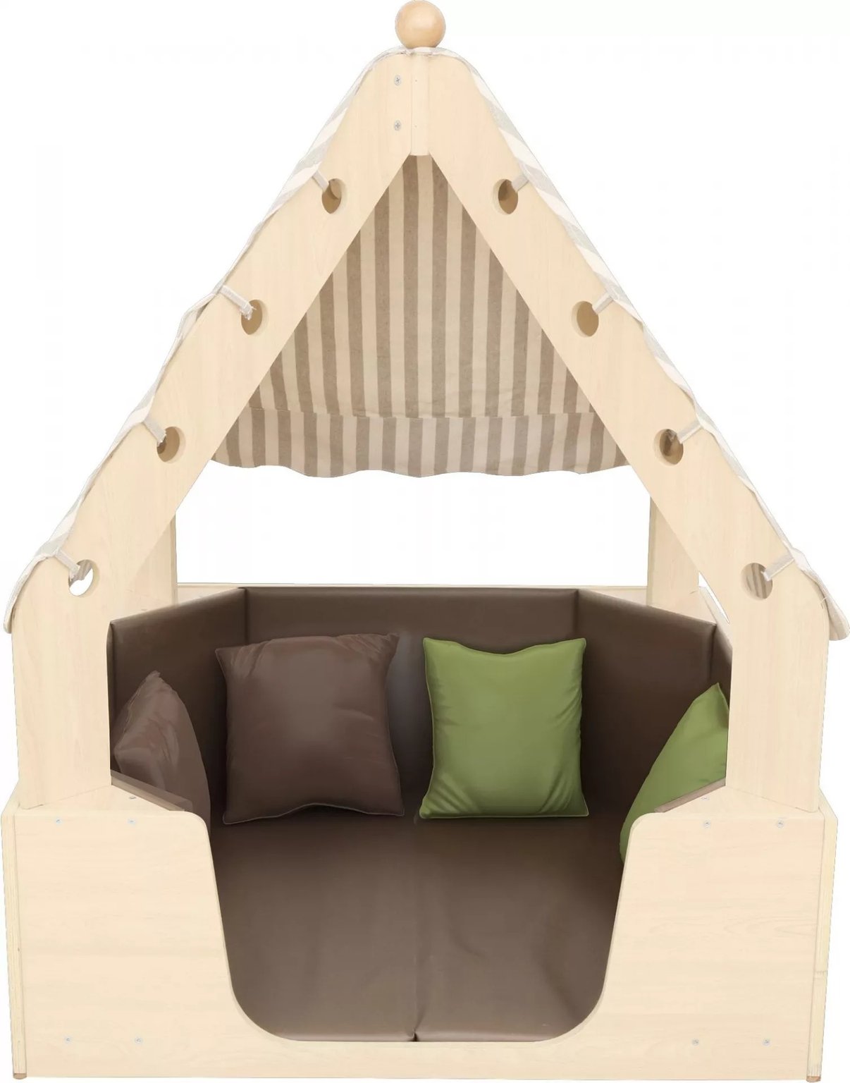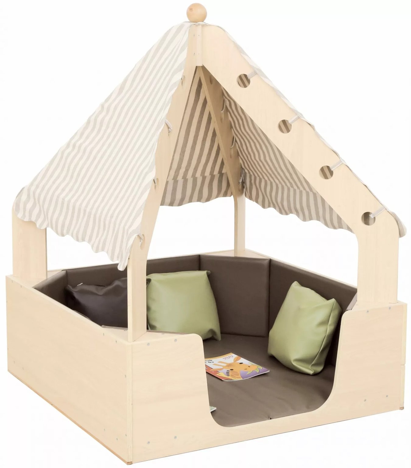 Cette structure en bois offre aux enfants un espace calme et sécuritaire pour se détendre, explorer et stimuler leur imagination