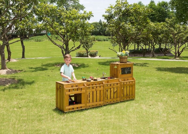 Ce meuble de jeu est renforcé par un panneau HPL et des pieds en WPC, qui augmentent sa stabilité et sa durabilité, même en usage intensif. Idéal pour stimuler l’imagination des enfants, ce réfrigérateur s’intègre parfaitement dans une cuisine de jeu et favorise le développement des compétences sociales et du langage à travers le jeu d’imitation.