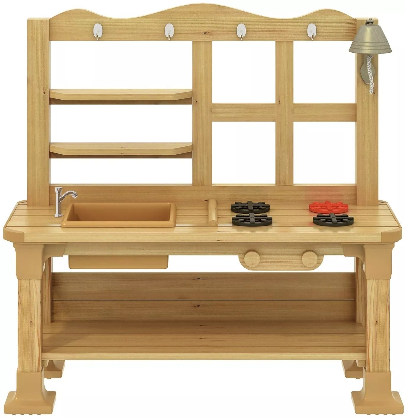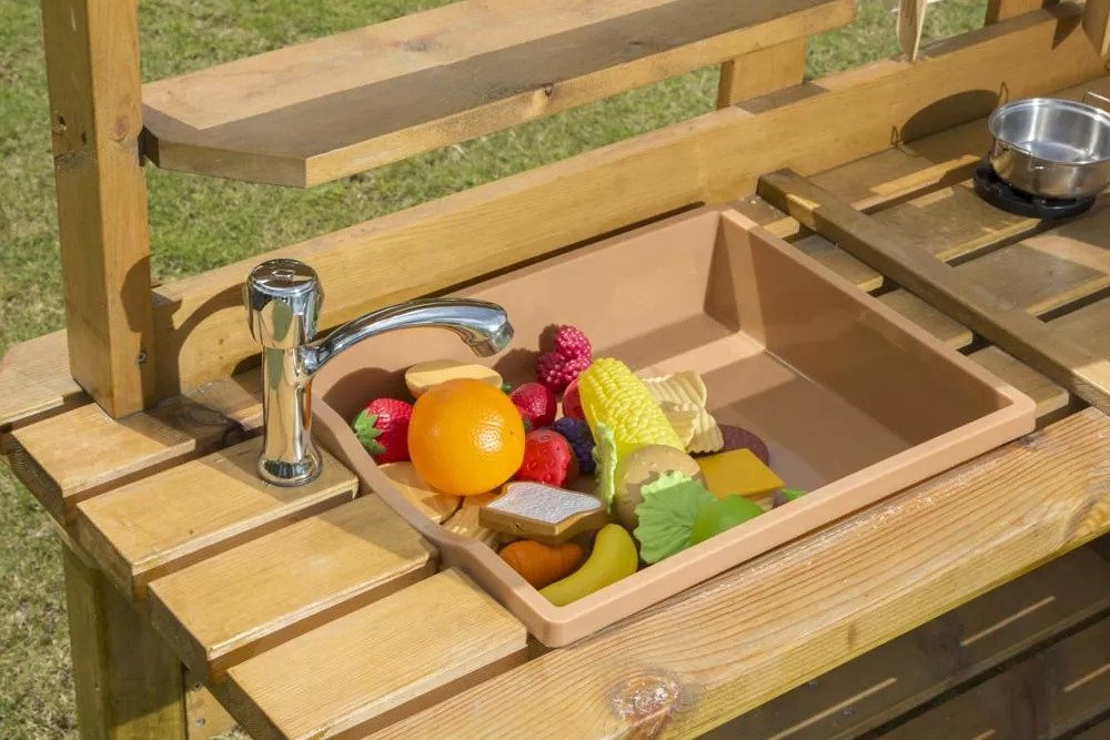 Dotée d’un évier avec robinet décoratif, de quatre plaques de cuisson équipées de boutons de réglage, ainsi que d’une cloche, cette cuisine encourage les jeux de rôle et les interactions sociales. Son grand espace de rangement permet d’organiser facilement les accessoires et ustensiles de cuisine. Fabriquée en pin imprégné en autoclave avec une double lasure naturelle à base d’huile dure, elle est conçue pour résister aux intempéries et durer dans le temps.