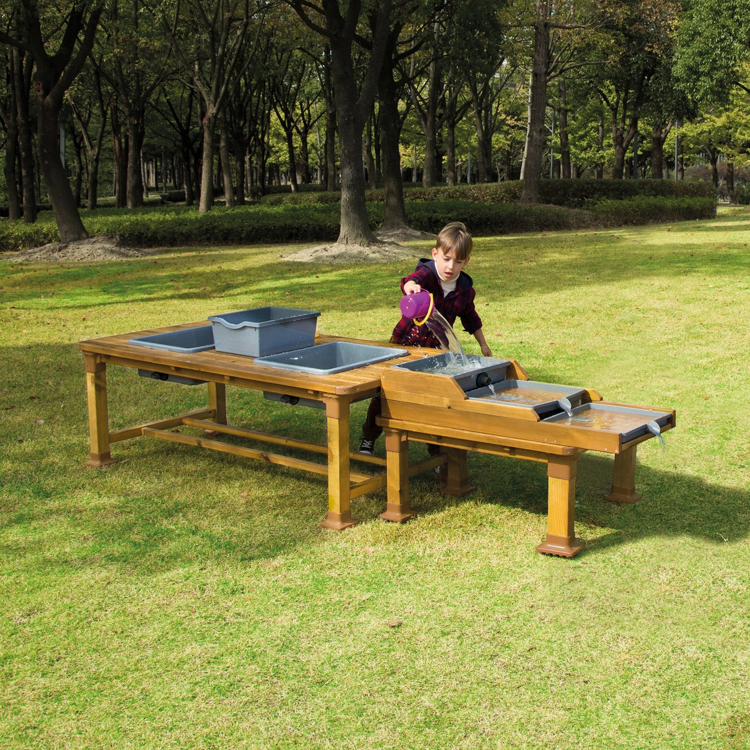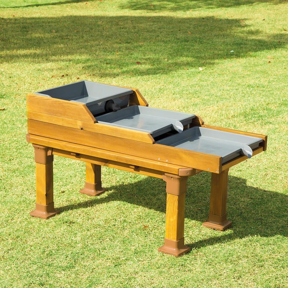 - Avec ses trois bassins d'eau amovibles en plastique, cette table permet de créer un véritable petit cours d'eau