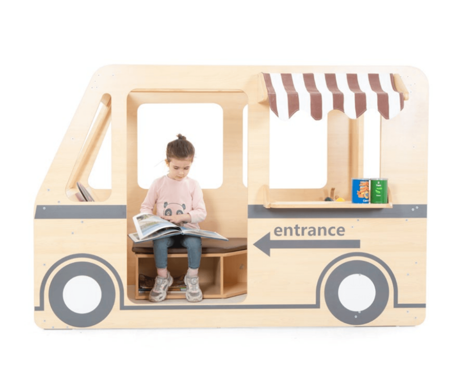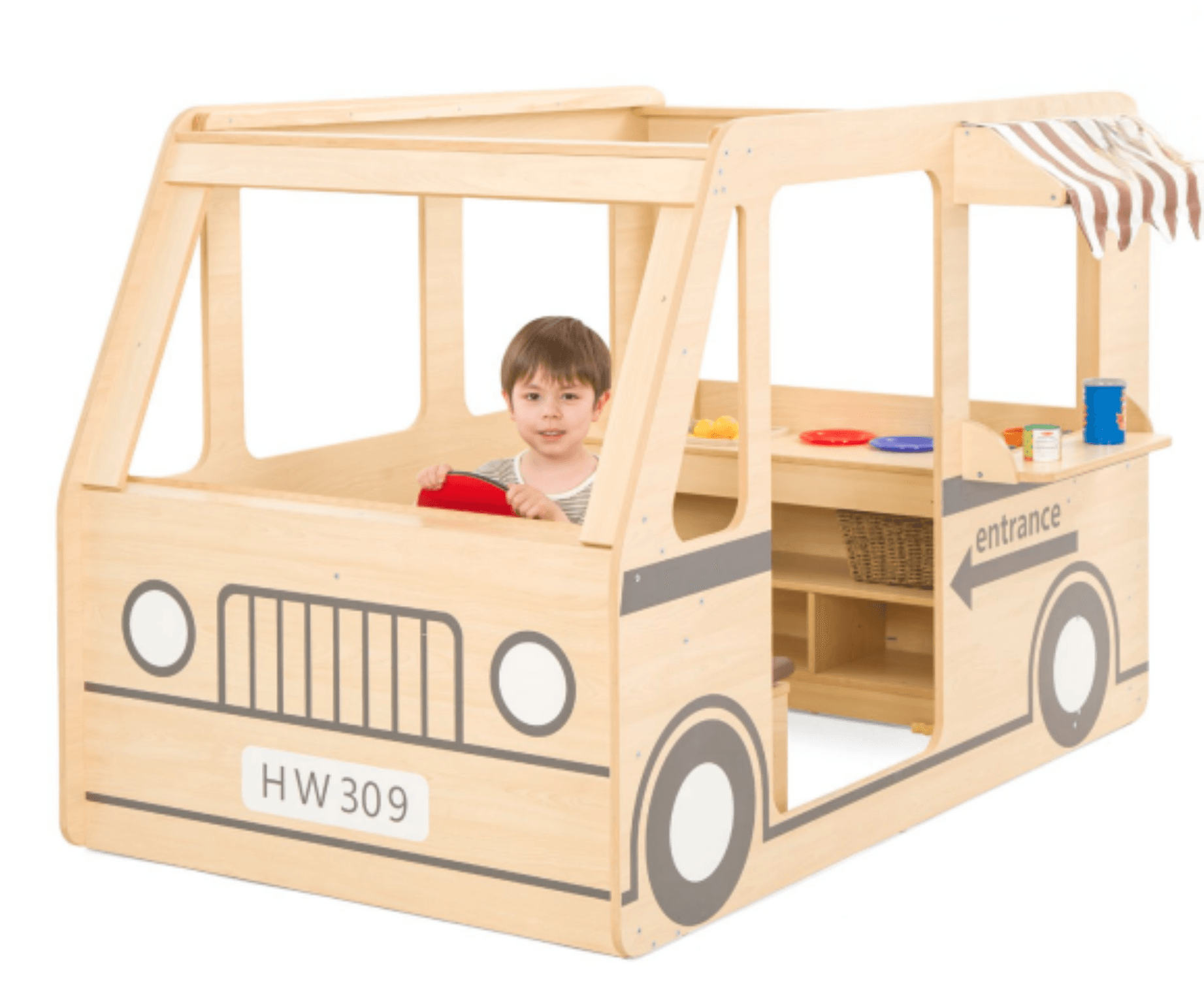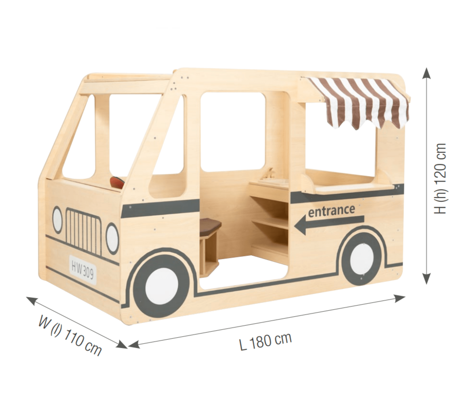 Grâce à ses dimensions généreuses (180 x 110 x 120 cm), plusieurs enfants peuvent jouer simultanément, favorisant ainsi le partage et la coopération. Son design attrayant et moderne éveille la curiosité des plus jeunes et invite à l'aventure, que ce soit pour "cuisiner" dans le food truck, "conduire" ou imaginer des histoires sans fin.
