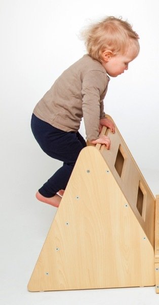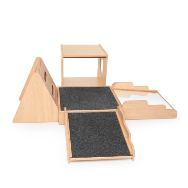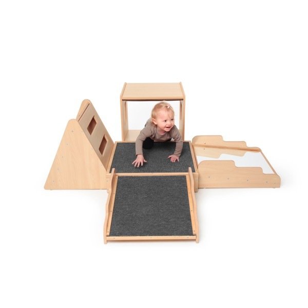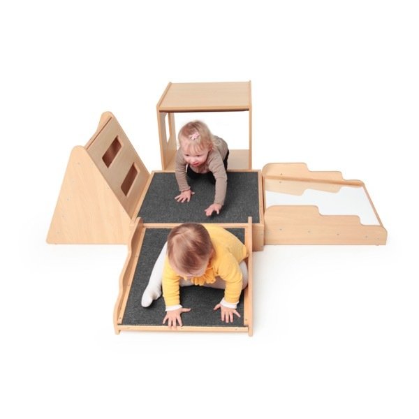 Parcours de motricité bois avec miroir composé de 5 modules individuels, qui peuvent être combinés en les emboîtant les uns dans les autres. Tunnel, miroir ou espalier : il faut tout essayer ! Idéal pour la salle de sport en crèche ou à l'école.