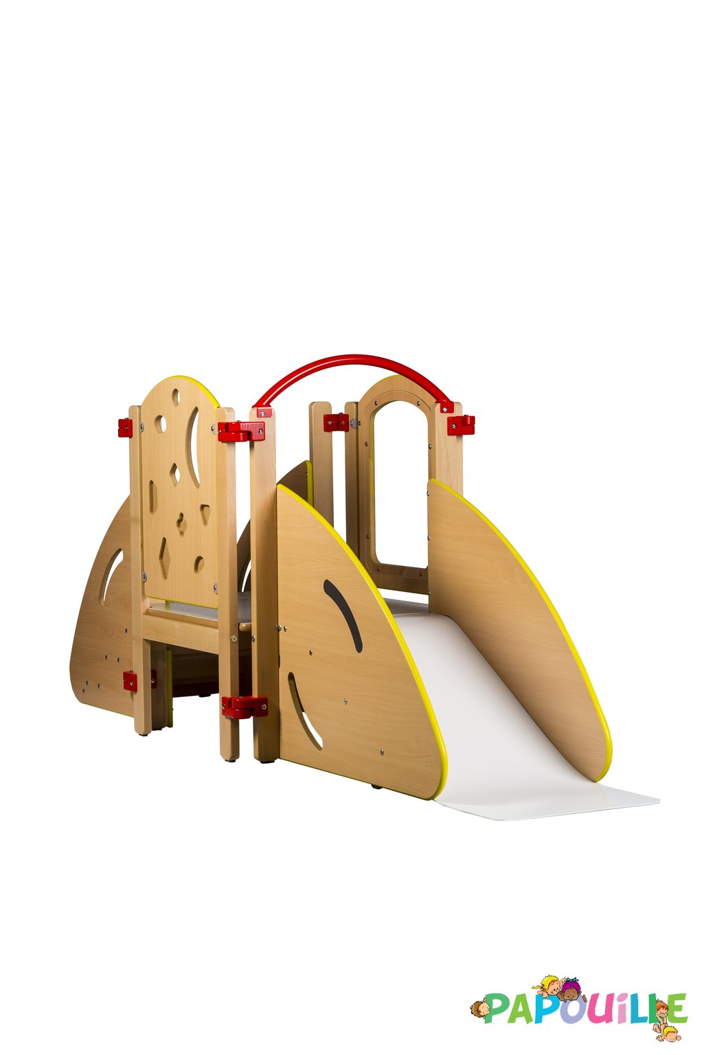 Le fond du toboggan de la structure d'activité pour collectivité est légèrement en concave avec une assise d'arrivée de cette façon à lui procurer un apprentissage de la glissade en douceur. On pourra également y trouver une barre de maintien afin de l’aider à utiliser cette structure.