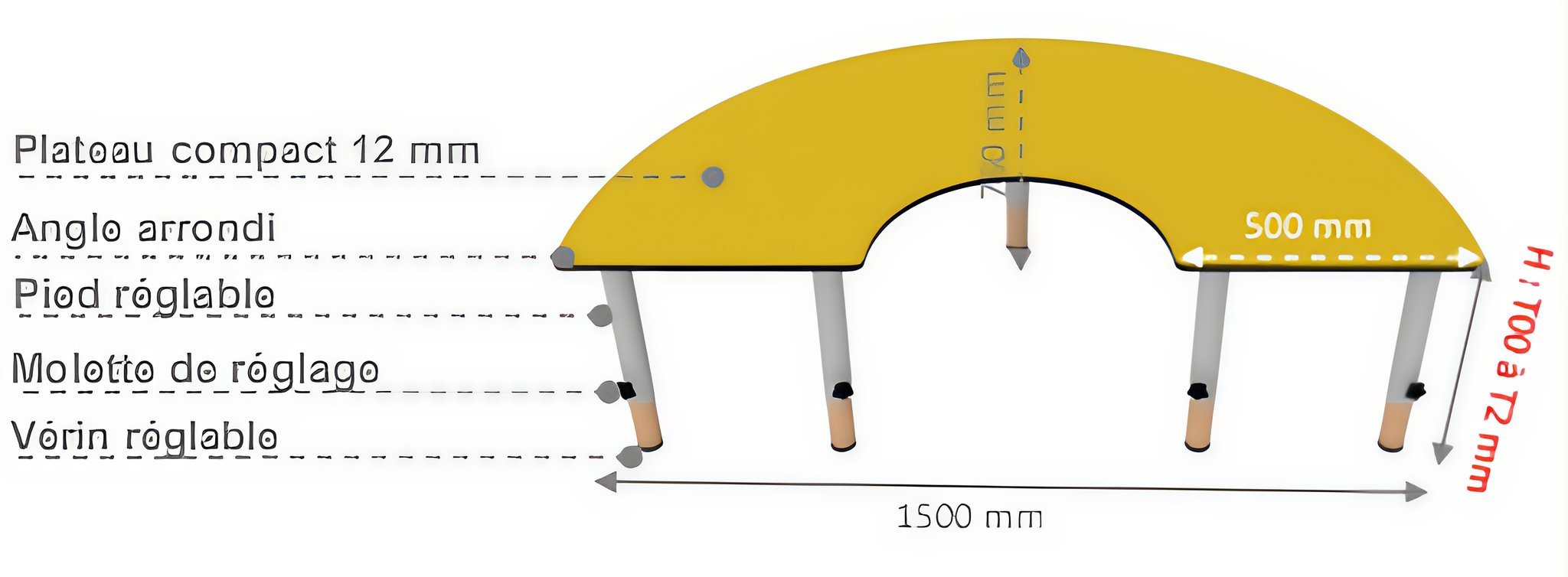 Idéale pour les structures d’accueil petite enfance, la table demi-lune réglable s’intègre parfaitement dans les aménagements de crèches, MAM ou écoles maternelles. Son design ergonomique, ses lignes douces et son format semi-circulaire favorisent un agencement modulable et une disposition conviviale pour les jeunes enfants dès 12 mois.