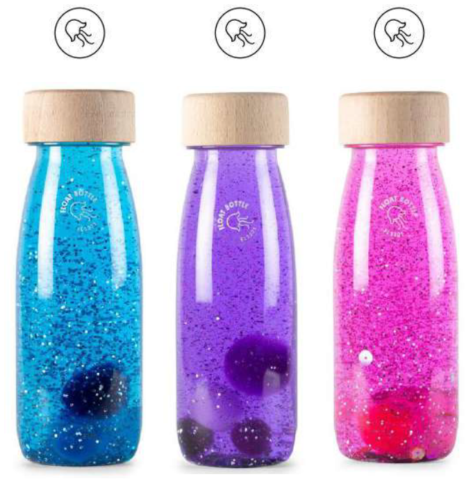 Cette bouteille sensorielle fait partie de la gamme Float Bottle. Petit Boum a attrapé une à une les couleurs de l'arc-en-ciel pour créer ces flacons magiques.
