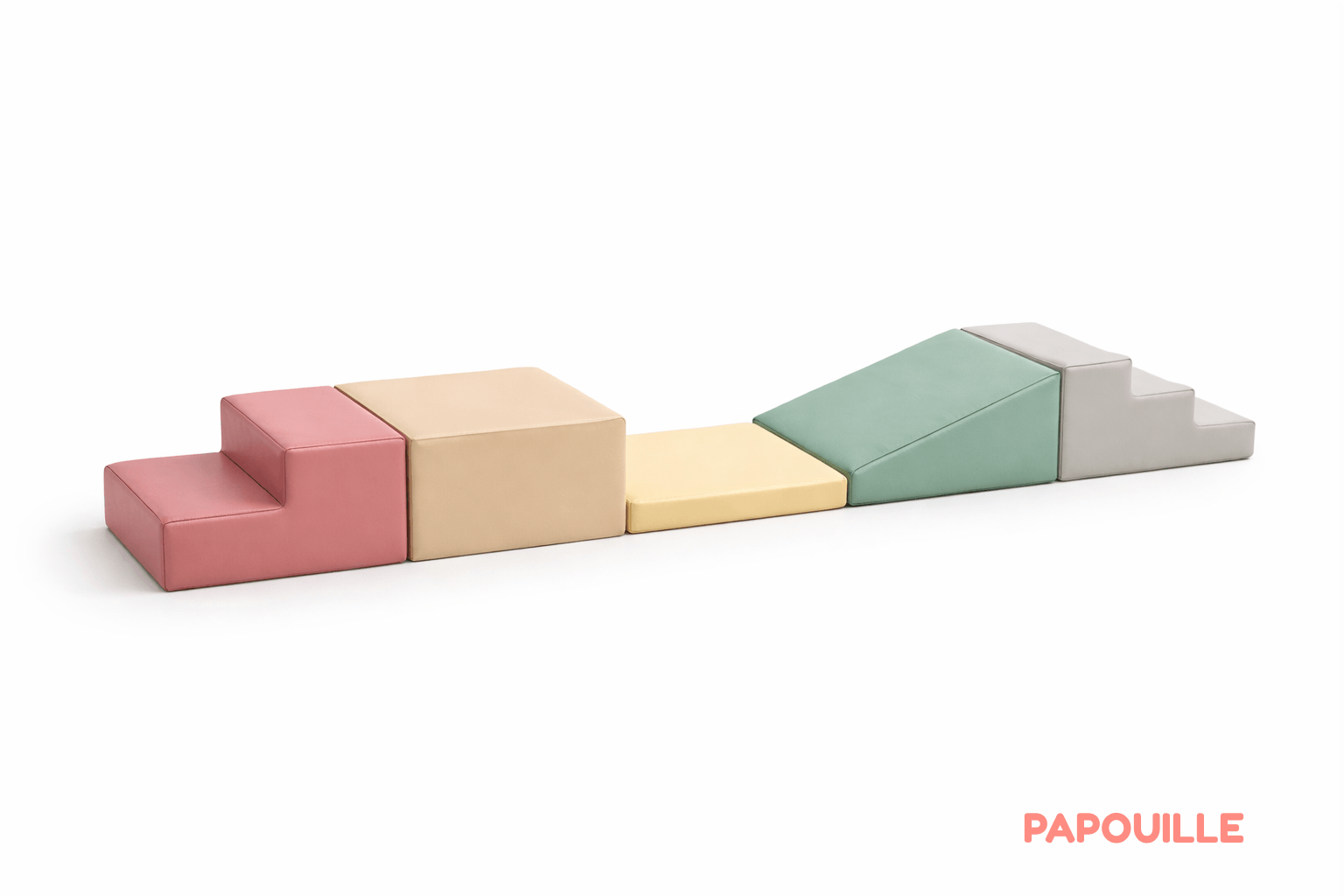 Parfait pour les crèches, micro-crèches, EAJE ou pour un usage professionnel à domicile (assistantes maternelles), ce parcours combine une rampe, deux types d’escaliers, un tapis plat et un module carré haut. L’ensemble forme un parcours linéaire fluide, idéal pour les jeux de motricité libre inspirés des pédagogies actives (Pikler, Montessori…).