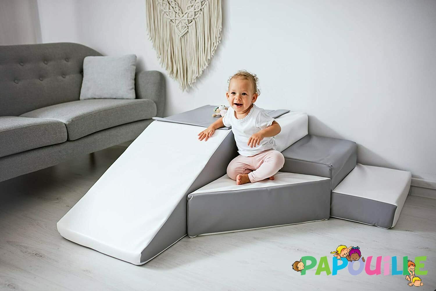 Chaque module est fabriqué en mousse polyéthylène de haute qualité, à la fois ferme et légère, assurant un excellent maintien tout en limitant les risques de blessures. Le revêtement en toile PVC sans phtalates est facile d’entretien. Grâce à ses propriétés ignifuges (Non Feu M2), ce parcours respecte les exigences de sécurité pour les jeunes enfants.