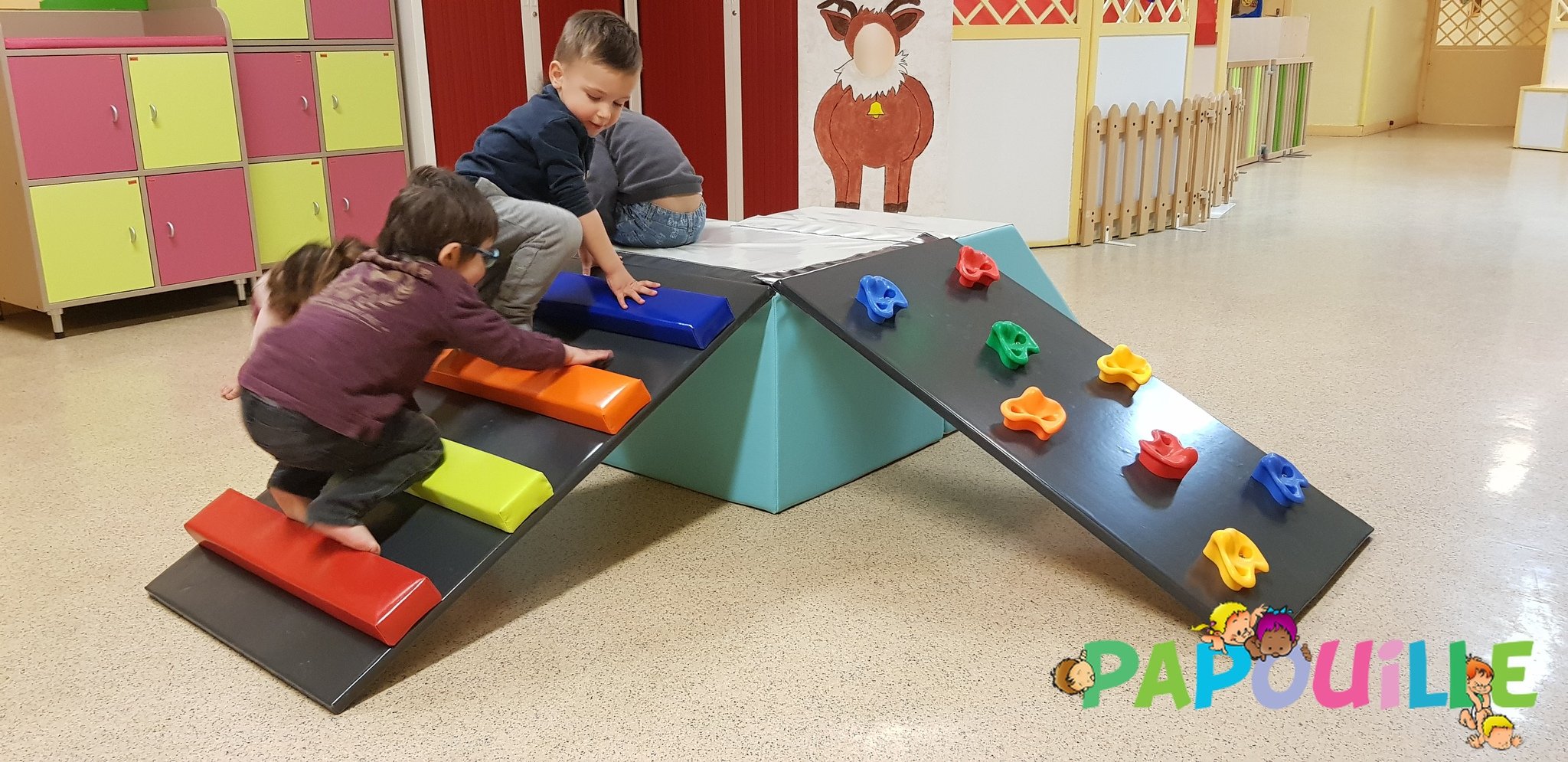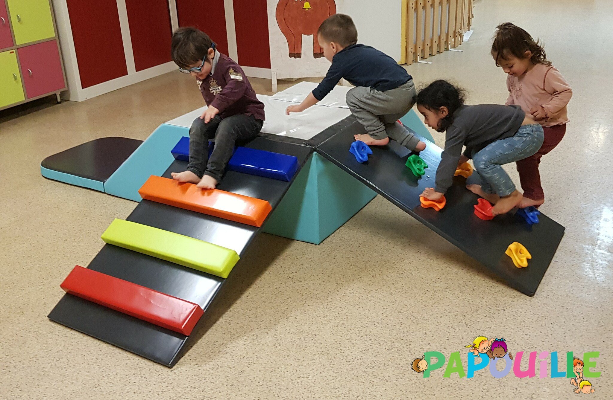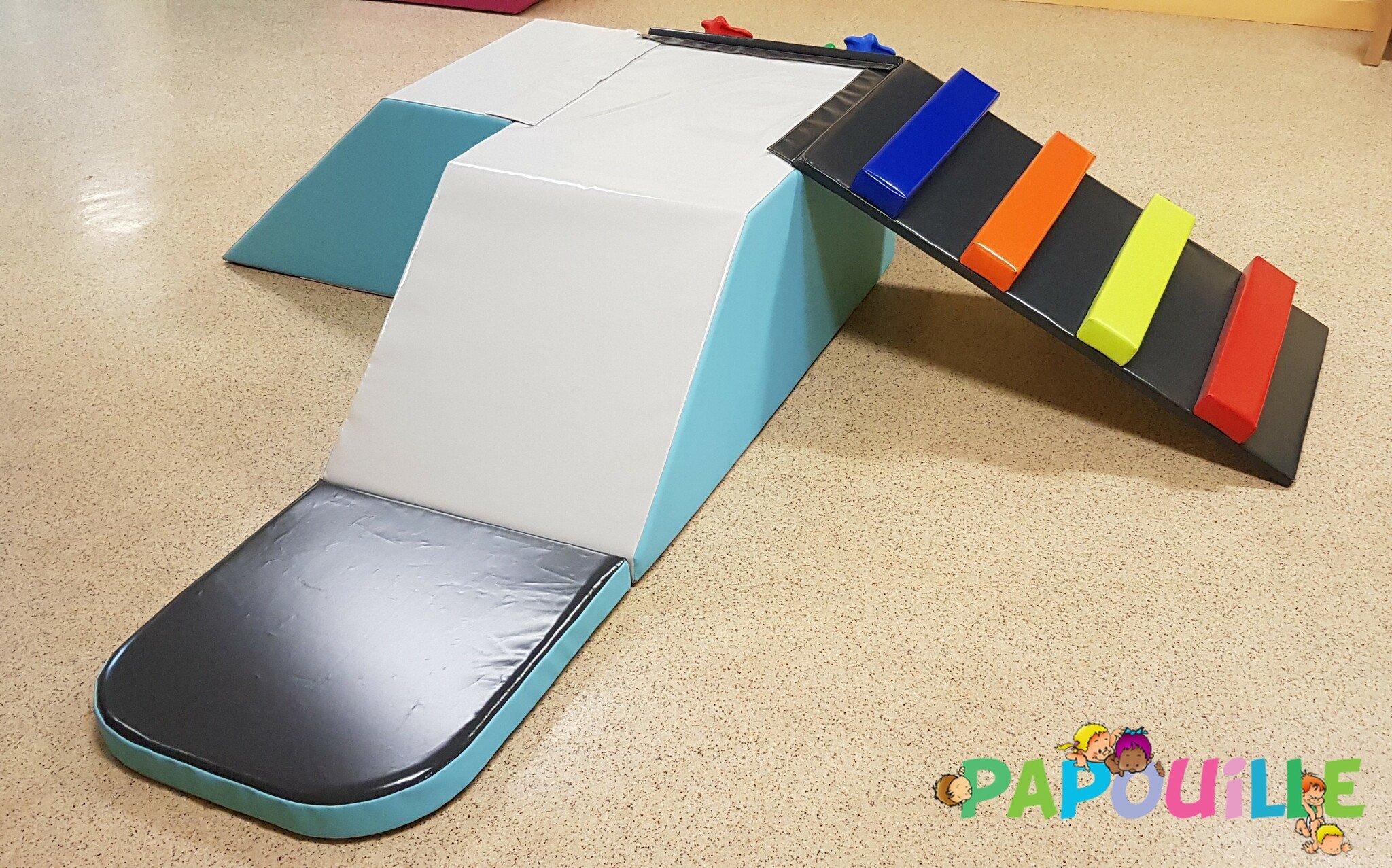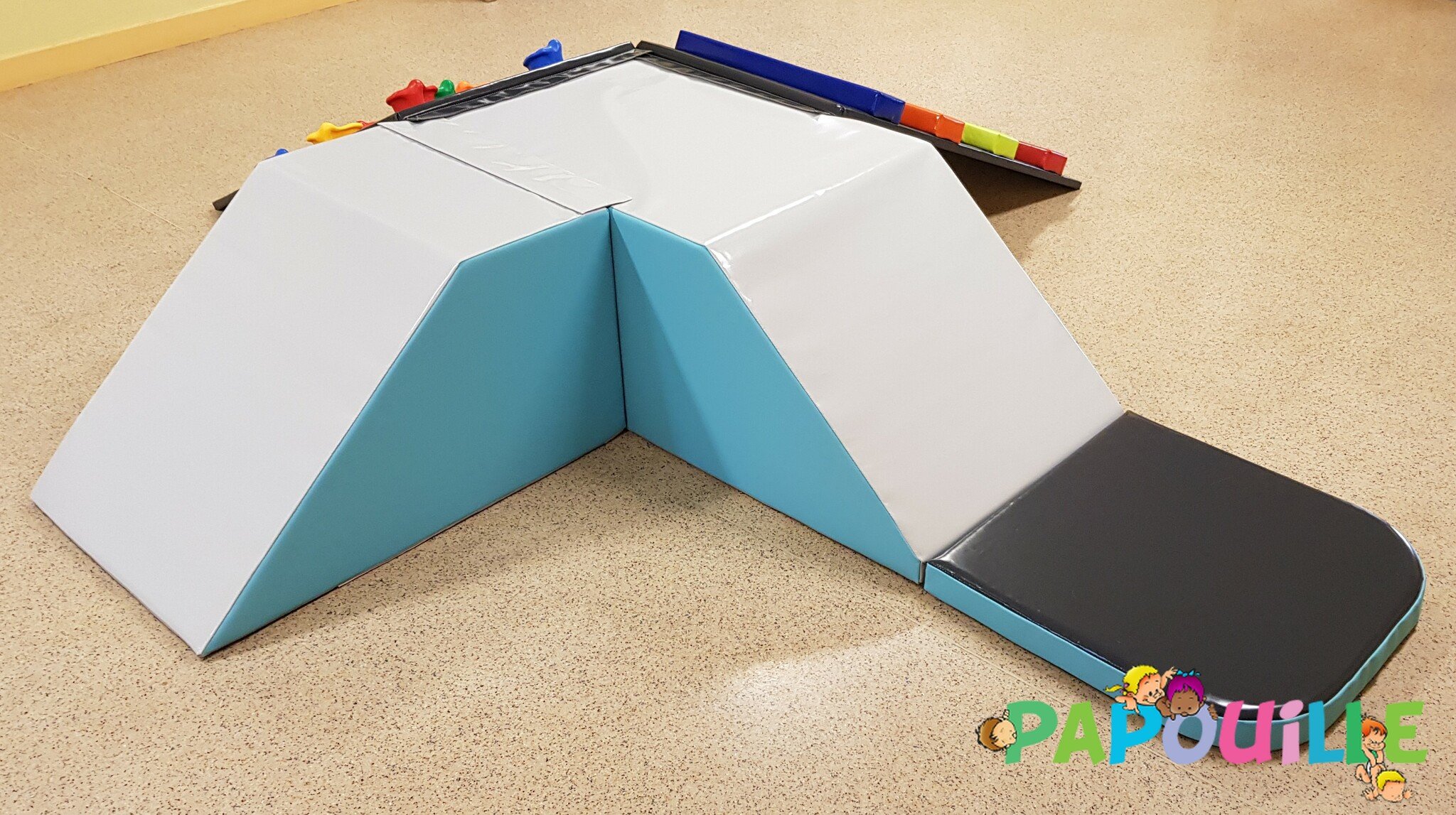 Papouille vous propose un parcours de motricité modulable 4 en 1 revêtement Bâche de très haute résistance pour une utilisation intensive en collectivité, crèche, maternelle.