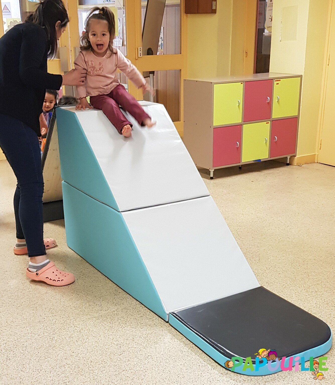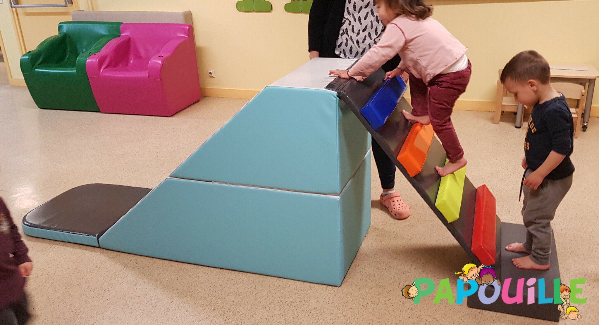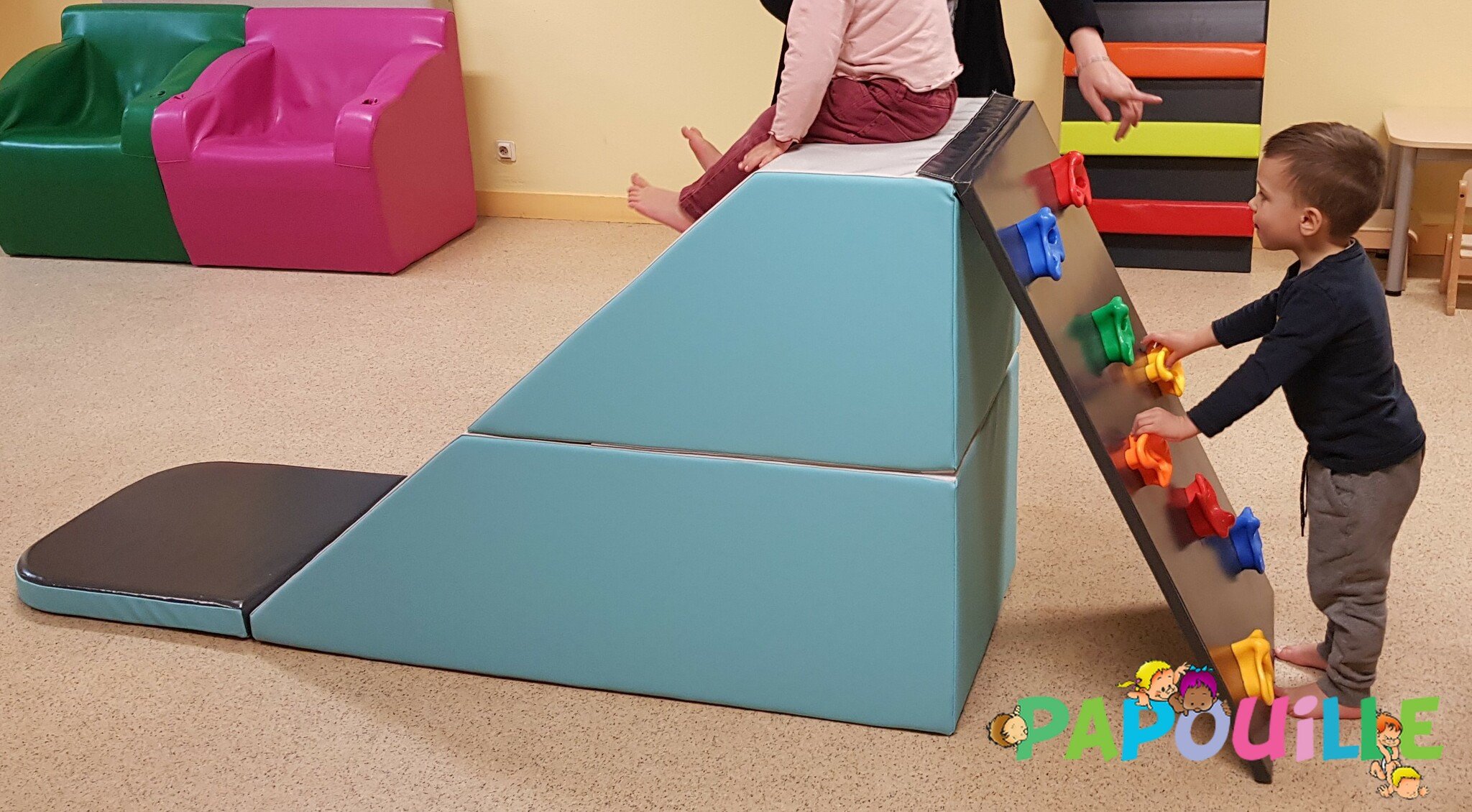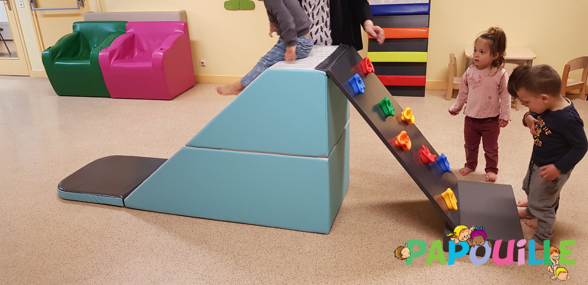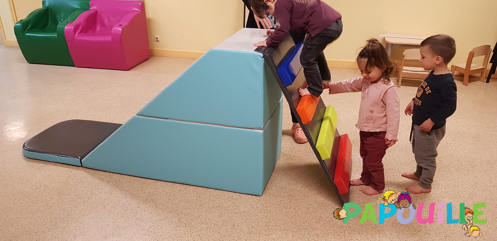 Papouille vous propose un parcours de motricité modulable 4 en 1 revêtement Bâche de très haute résistance pour une utilisation intensive en collectivité, crèche, maternelle.