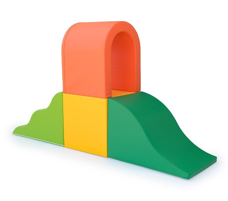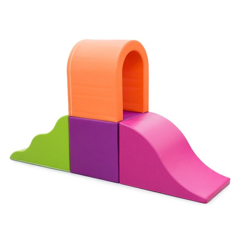 Le parcours se compose d'un tapis bleu pour assurer une réception douce, une rampe verte permettant l'ascension et le développement de la coordination, un escalier bleu de quatre marches pour encourager la prise de risque calculée et le calcul des distances, deux supports rouges pour la stabilité et le soutien, ainsi qu'une demi-roue bleue et jaune qui invite à l'équilibre et à la découverte de nouvelles façons de bouger. Ce mélange de couleurs vives et de formes variées stimule non seulement l'activité physique mais aussi l'imagination et la créativité des enfants.