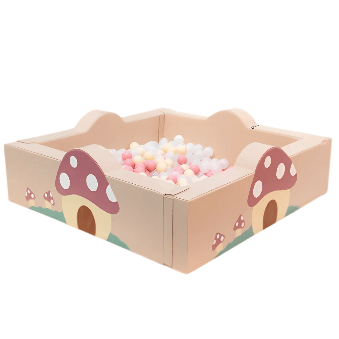 Son design carré aux dimensions généreuses permet d’accueillir plusieurs enfants simultanément, favorisant les interactions sociales, la motricité globale et la coordination. Les motifs cousus en forme de champignons sur les parois apportent une ambiance chaleureuse et ludique, parfaite pour un univers thématique "forêt enchantée".
