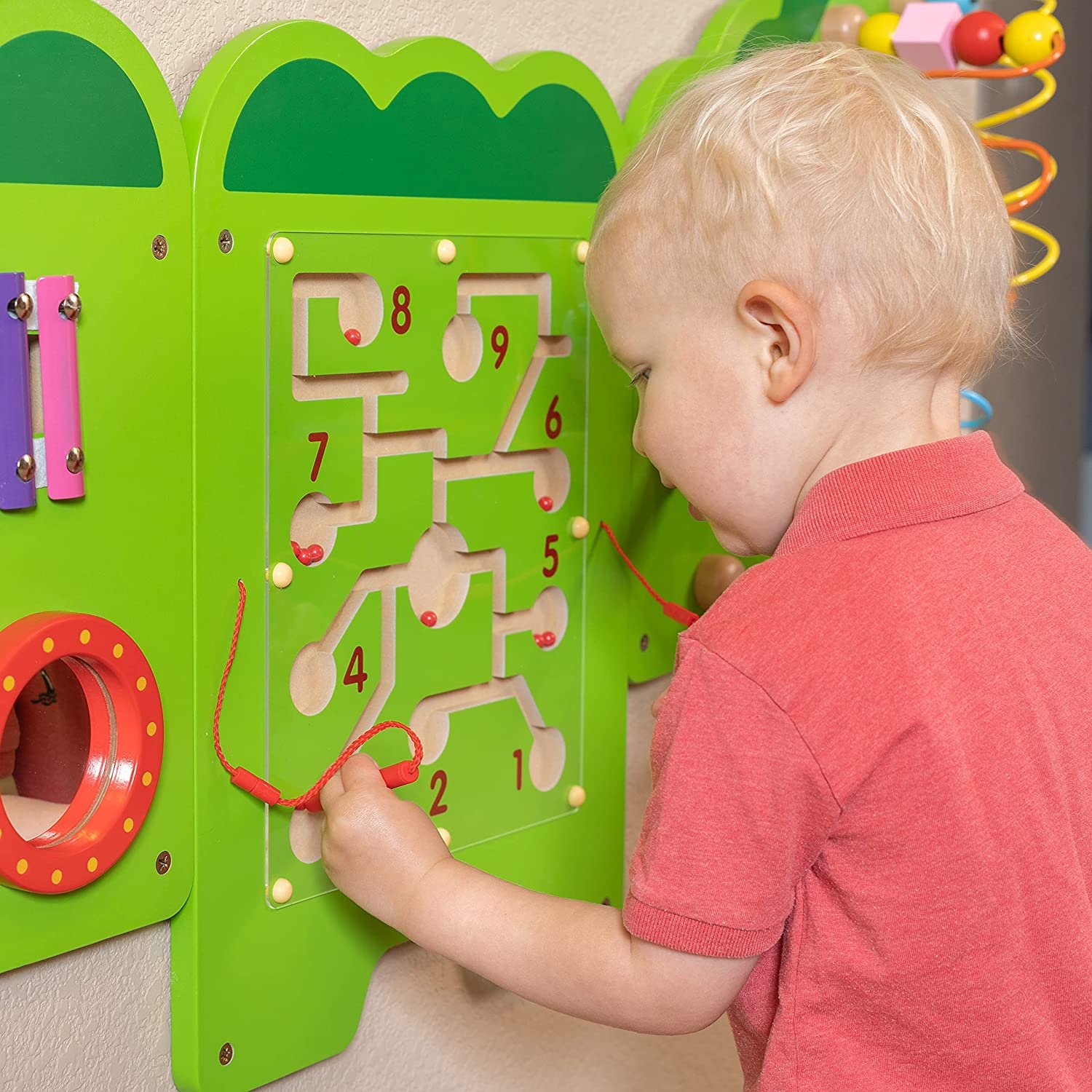 Le grand crocodile d'activités mural est un compagnon de jeu idéal pour développer la motricité fine, la coordination œil-main et la créativité de votre enfant. Il stimule son imagination et l'encourage à explorer de nouvelles textures, formes et couleurs tout en s'amusant.