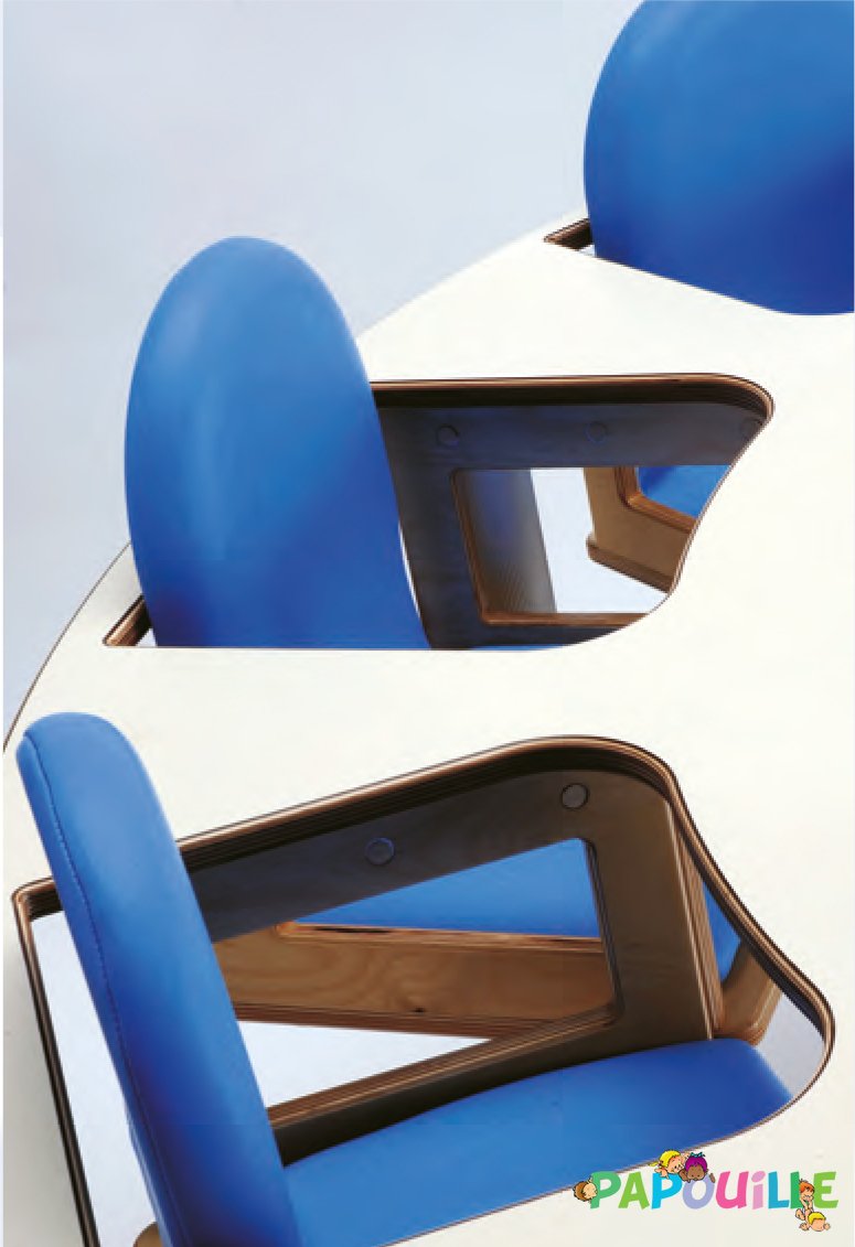 - Sièges molletonnés plastifiés amovibles pour faciliter l'entretien, avec ceinture de tour de taille, butée d'entre jambes rejoignant l'assise et le plateau de la table.