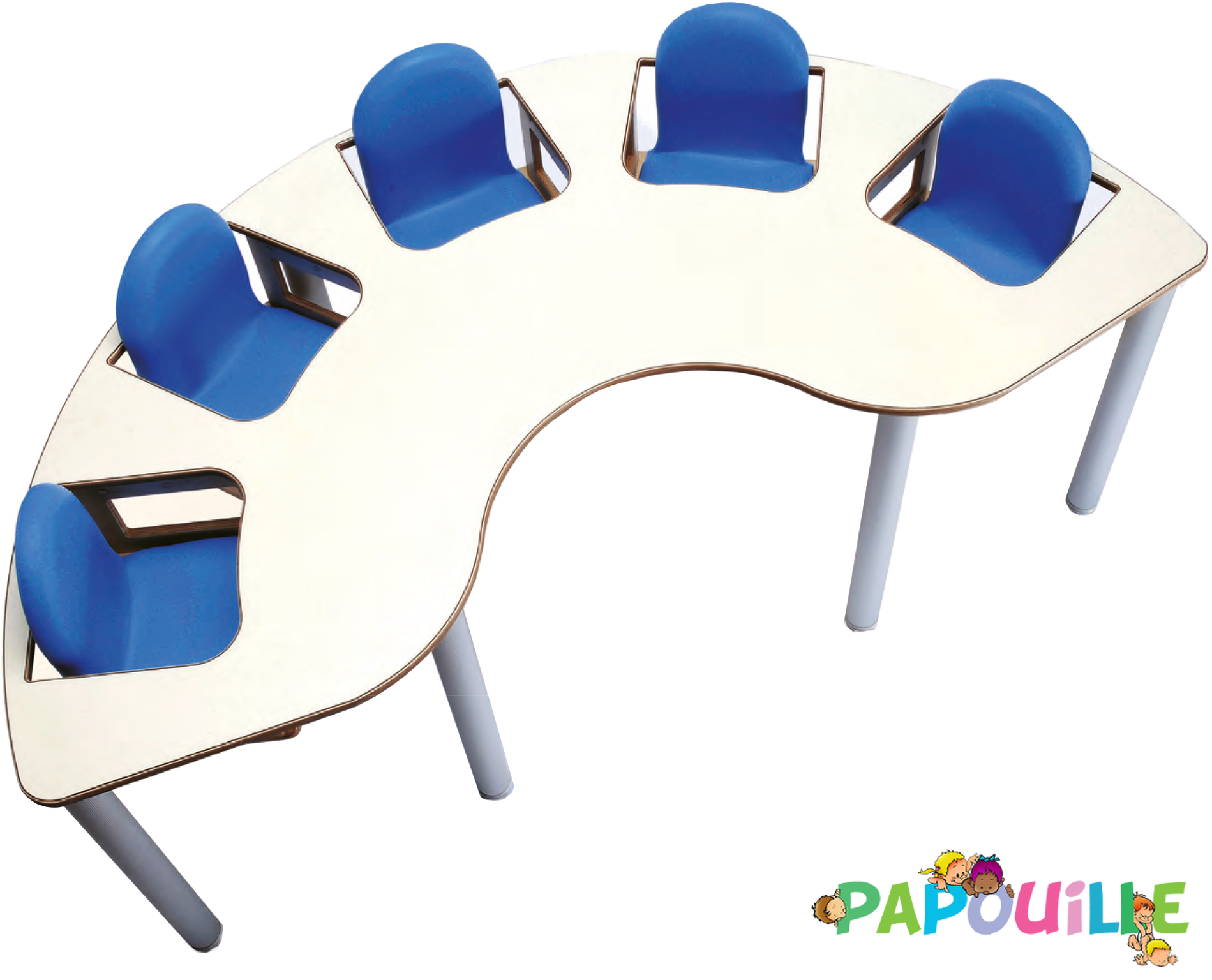 Elle va permettre de nourrir 5 enfants en même temps et dans un même endroit, où l'adulte pourra s'asseoir au milieu pour surveiller les enfants, mais aussi manger en même temps.