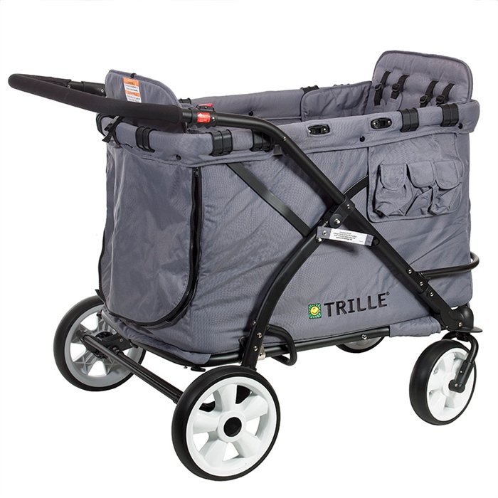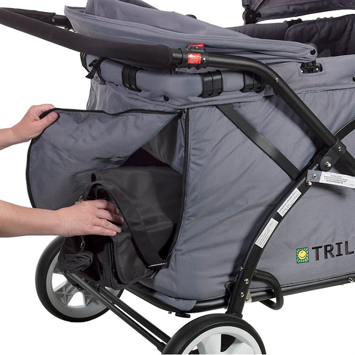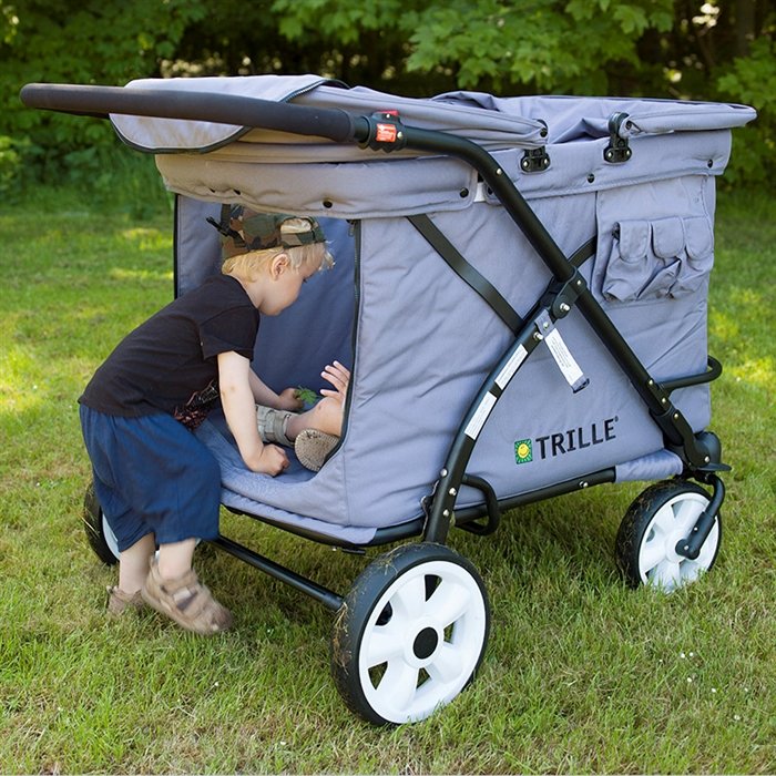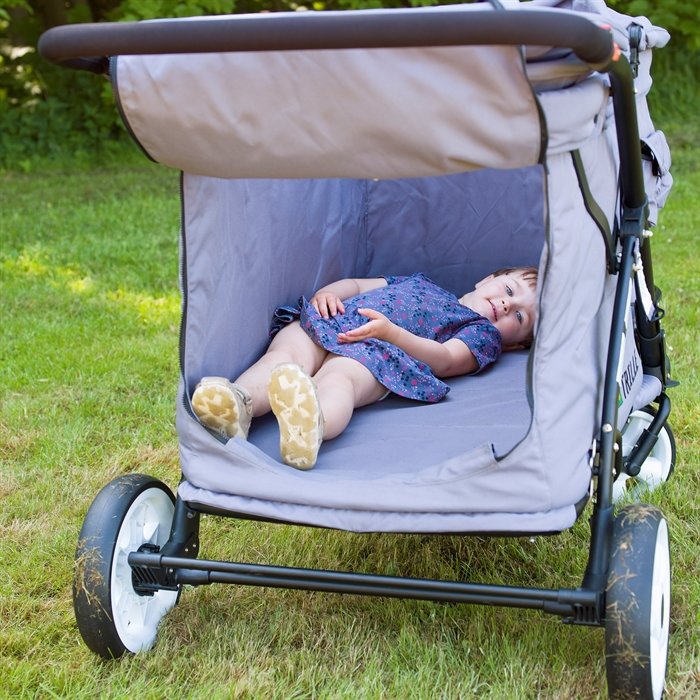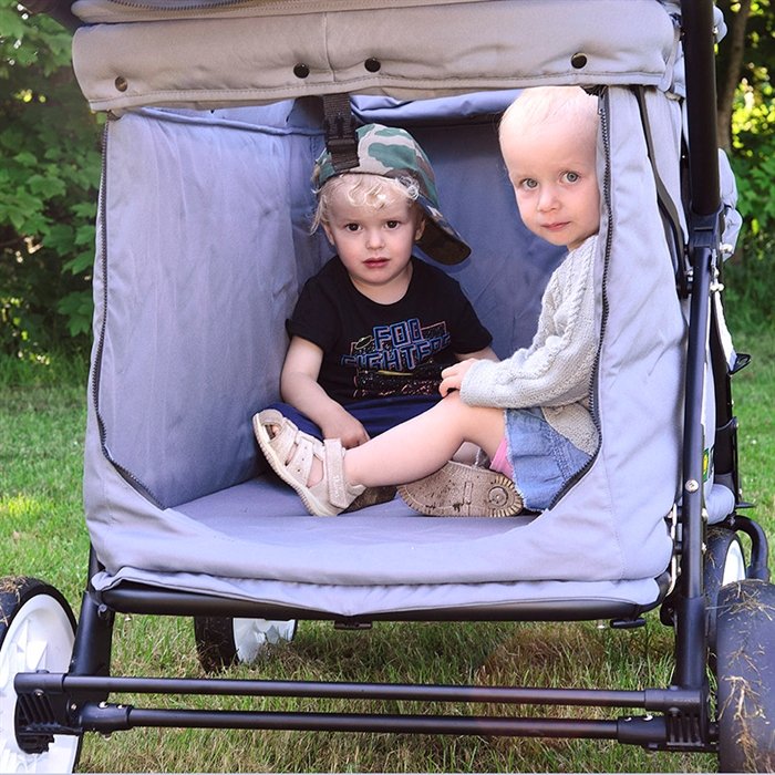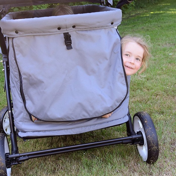 Avec une ouverture zippée sur le côté conducteur, les enfants peuvent facilement monter et descendre de la poussette de manière autonome, ce qui facilite les déplacements au quotidien. Pour plus de flexibilité, la poussette peut également être utilisée avec seulement deux sièges, laissant ainsi de l’espace supplémentaire pour transporter des accessoires tels que des matelas, des boîtes à déjeuner, ou d'autres bagages nécessaires lors de promenades ou sorties en groupe.