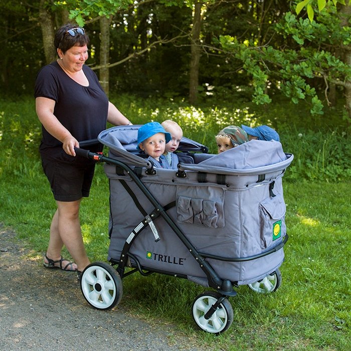La poussette est conçue pour transporter jusqu'à quatre enfants de manière sécurisée et confortable, idéale pour les crèches, micro-crèches, EAJE et autres structures d'accueil de la petite enfance. Elle se distingue par sa polyvalence et ses nombreuses fonctionnalités. Équipée de quatre sièges rembourrés dotés chacun d’un harnais de sécurité à 5 points, cette poussette assure une sécurité optimale pour les enfants à partir de 6 mois. Chaque siège est indépendant et peut supporter un poids de 22 kg. Les sièges amovibles peuvent être retirés pour transformer la poussette en un lit de voyage pratique, ce qui en fait un équipement multifonction pour les professionnels de la petite enfance.