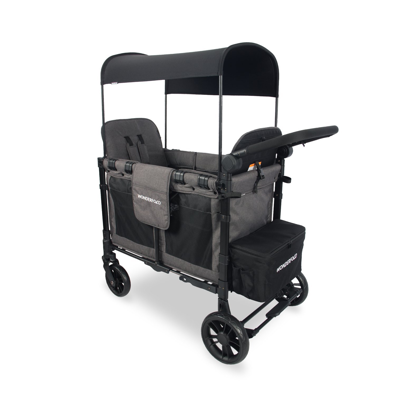Les deux sièges surélevés, équipés de harnais 5 points, offrent un confort enveloppant tout en permettant une vision dégagée, que ce soit face à l’adulte ou vers l’extérieur. Le système de porte zippée à l’avant et à l’arrière facilite l’installation des jeunes enfants sans manipulation contraignante.Son auvent UPF 50+ amovible et ajustable assure une protection solaire optimale, essentielle pour les sorties prolongées.