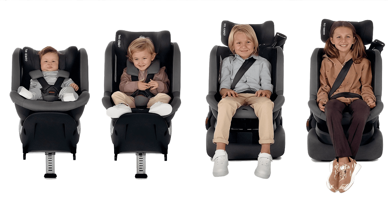 À partir de 76 cm, une option permet de positionner le siège face à la route, toujours en utilisant les connecteurs ISOFIX et le harnais du siège. À partir de 100 cm, l’installation se fait avec les connecteurs ISOFIX en combinaison avec la ceinture de sécurité du véhicule. Cette configuration évolutive garantit une sécurité maximale tout en suivant la croissance de l’enfant.