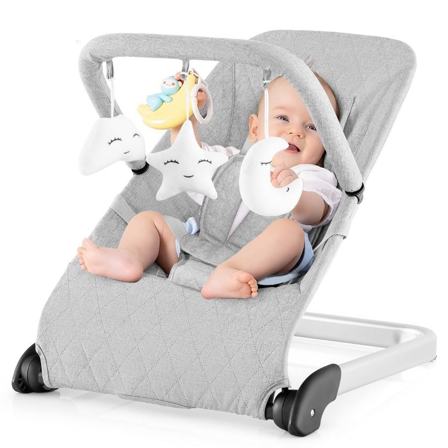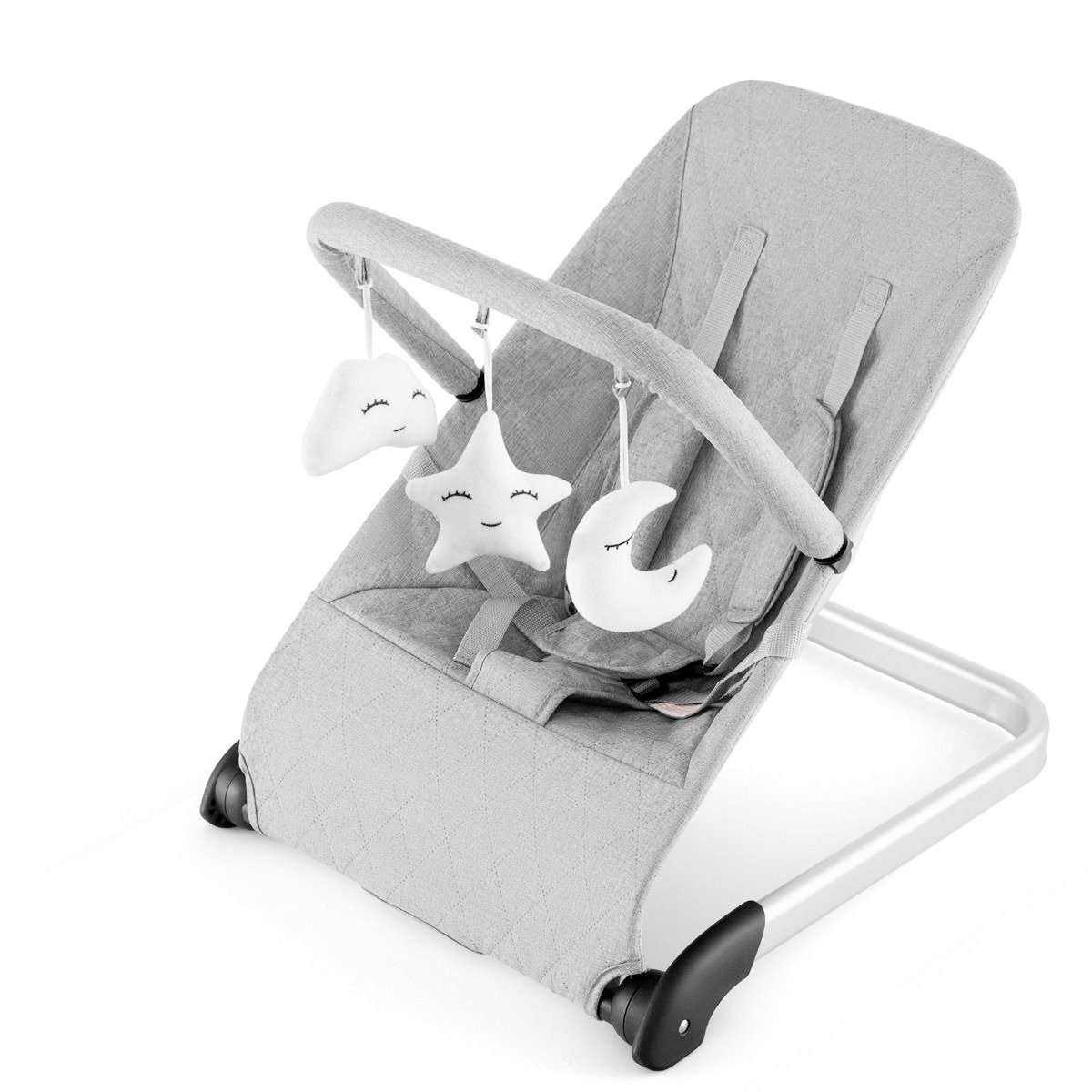 Pour la sécurité, ce transat est équipé d’un harnais réglable à 5 points, adapté aux nouveau-nés, ainsi que de patins antidérapants qui empêchent tout basculement. La barre de jeu détachable avec 3 jouets stimulants favorise l’éveil des tout-petits et peut être retirée en un clin d'œil.