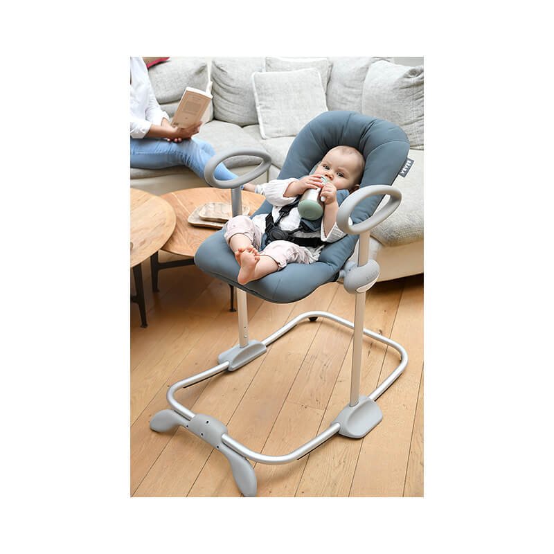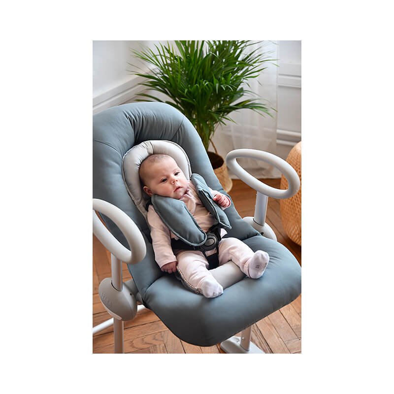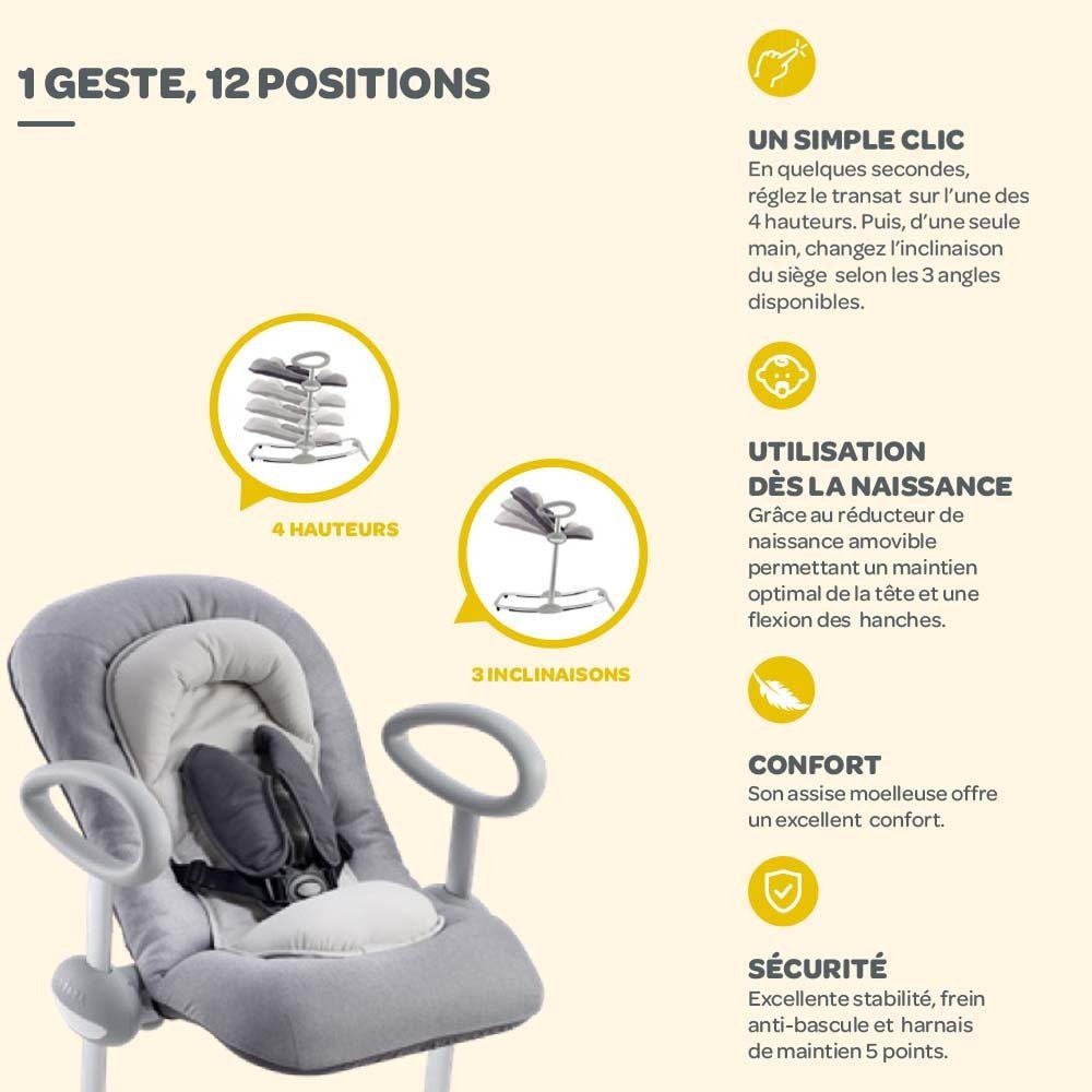 Son dossier inclinable qui peut être ajusté en position assise, intermédiaire ou allongée offre à l’enfant différentes positions lui permettant de s’éveiller ou de se reposer sereinement.