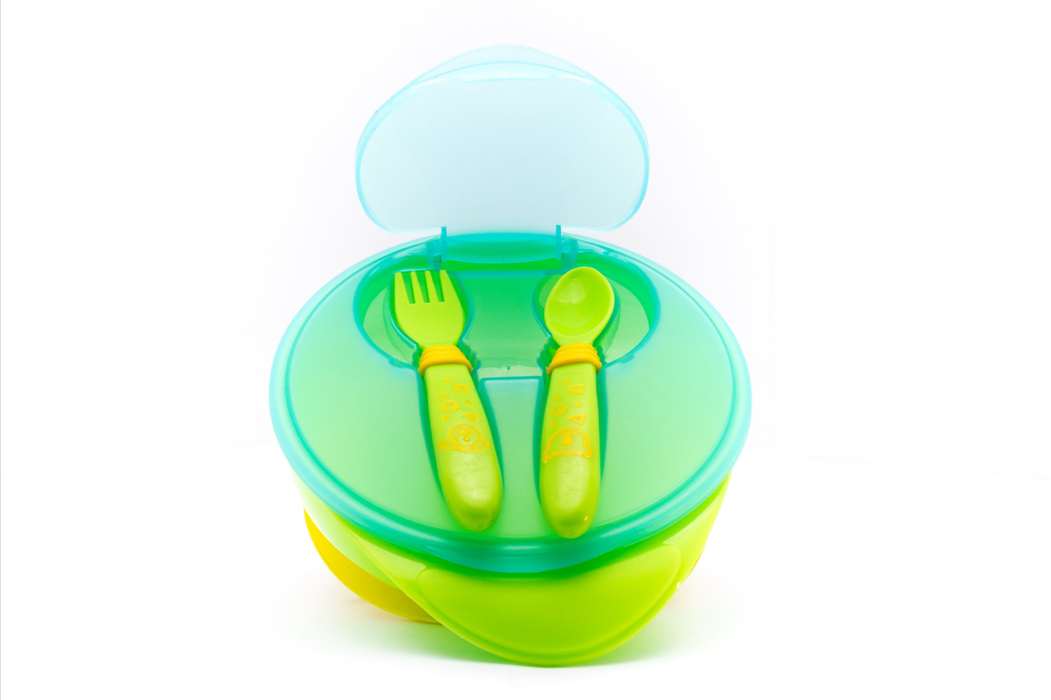 Tout en un pour le repas de bébé, les couverts se rangent dans le couvercle qui permet de conserver les aliments au chaud dans l'assiette.