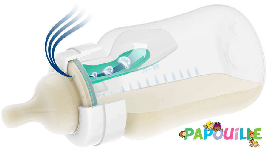 Papouille vous propose ce biberon Avent 260 mL col large avec tétine à système anti-coliques comportant une valve AirFree conçue pour réduire l'ingestion d'air. La succion facilitée et la texture rainurée évitent l'écrasement de la tétine pour une tétée ininterrompue.